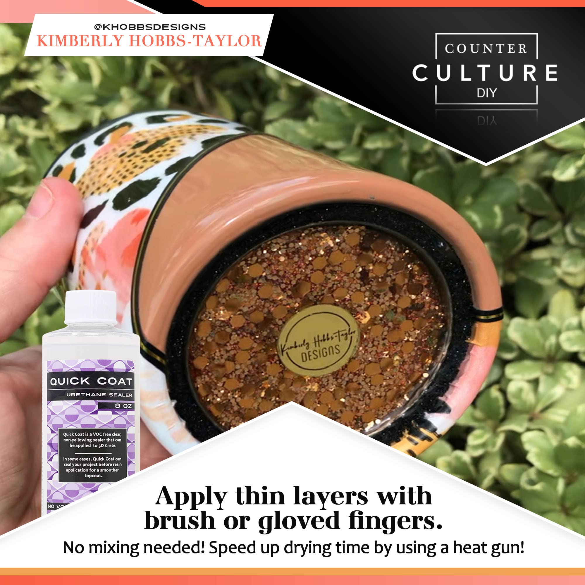 INCLUDES: Counter Culture DIY 4 Ounce Quick Coat Sealer. Quick Coat is a VOC free, clear, non-yellowing sealer. It makes the perfect surface for your next layer of resin. PROTECT YOUR ART: The Quick Coat sealer is the perfect first step in your resin art project. Seal your art into place before pouring resin with Quick Coat, that way your art doesn't move and you have a crystal clear smooth finish to pour the resin on top of. MULTI-PURPOSE: Not only can you apply Quick Coat to seal marble dips, glitter, vinyl and decals - but it's perfect for applying glitter or fabric to your smaller projects as well like jewelry, keychains, or tumblers. HOW TO USE: Apply a very thin layer of Quick Coat to your work with a brush or your gloved finger. After the first layer is dry to the touch, apply a second layer in the same fashion as the first. Make sure Quick Coat is completely dry before applying resin. You can use a dryer or heat gun to speed up this process. THE PERFECT GIFT: For yourself, or that special maker, DIY'er, craftsman or woman in your life. We offer cosmetic-grade color pigments, artist resin, unfinished wood circle cutouts, and acrylic pouring primer, all designed to work beautifully together! INCLUDES: Counter Culture DIY 8 Ounce Quick Coat Sealer. Quick Coat is a VOC free, clear, non-yellowing sealer. It makes the perfect surface for your next layer of resin. PROTECT YOUR ART: The Quick Coat sealer is the perfect first step in your resin art project. Seal your art into place before pouring resin with Quick Coat, that way your art doesn't move and you have a crystal clear smooth finish to pour the resin on top of. MULTI-PURPOSE: Not only can you apply Quick Coat to seal marble dips, glitter, vinyl and decals - but it's perfect for applying glitter or fabric to your smaller projects as well like jewelry, keychains, or tumblers. HOW TO USE: Apply a very thin layer of Quick Coat to your work with a brush or your gloved finger. After the first layer is dry to the touch, apply a second layer in the same fashion as the first. Make sure Quick Coat is completely dry before applying resin. You can use a dryer or heat gun to speed up this process. THE PERFECT GIFT: For yourself, or that special maker, DIY'er, craftsman or woman in your life. We offer cosmetic-grade color pigments, artist resin, unfinished wood circle cutouts, and acrylic pouring primer, all designed to work beautifully together! 𝐏𝐥𝐞𝐚𝐬𝐞 𝐧𝐨𝐭𝐞: Packaging and labels may vary due to recent branding updates.