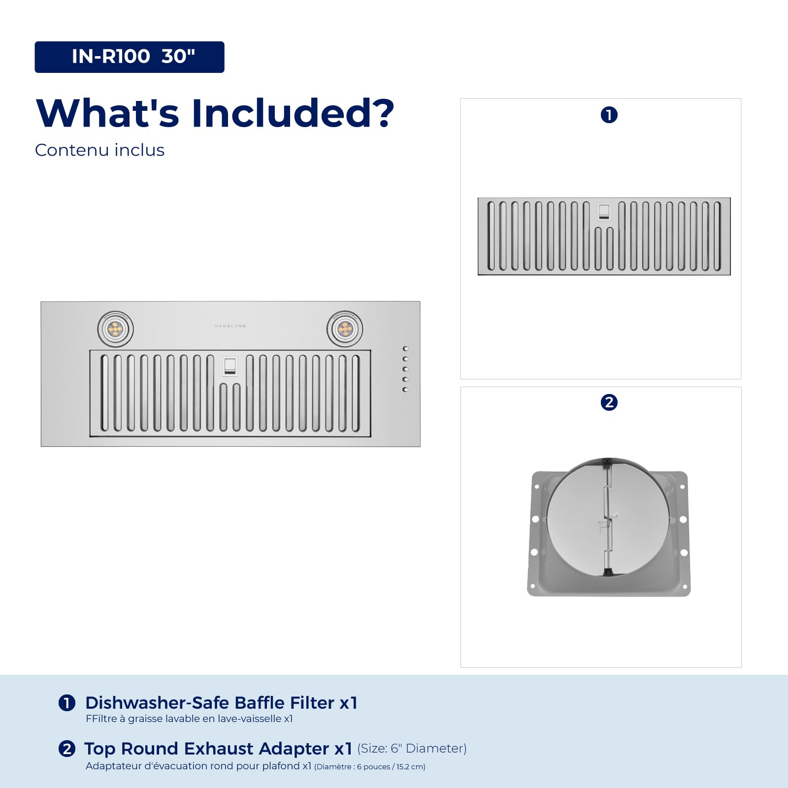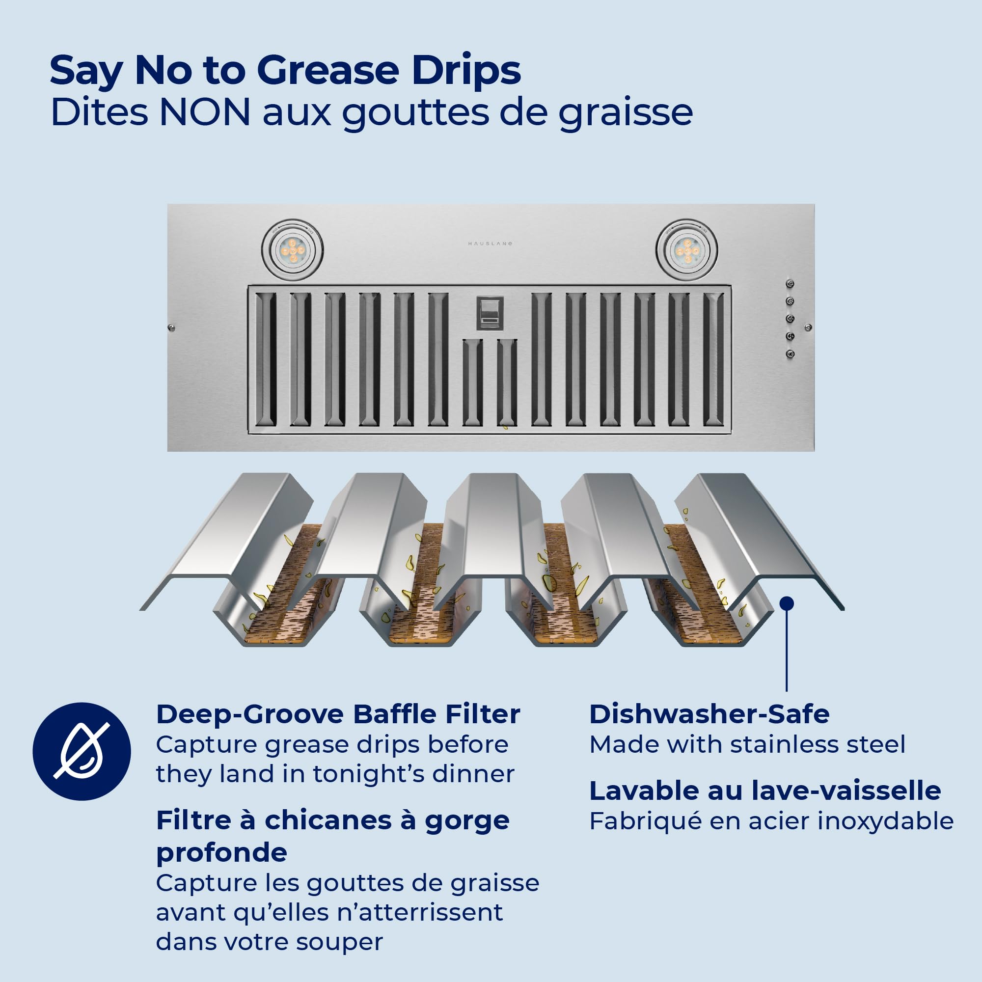 FILTERS CATCH GREASE BEFORE IT DRIPS: Don’t let grease particles stain and smell up your kitchen. The stainless steel baffle filters catch grease before they drip down on your cabinets, countertops, walls, and floors.