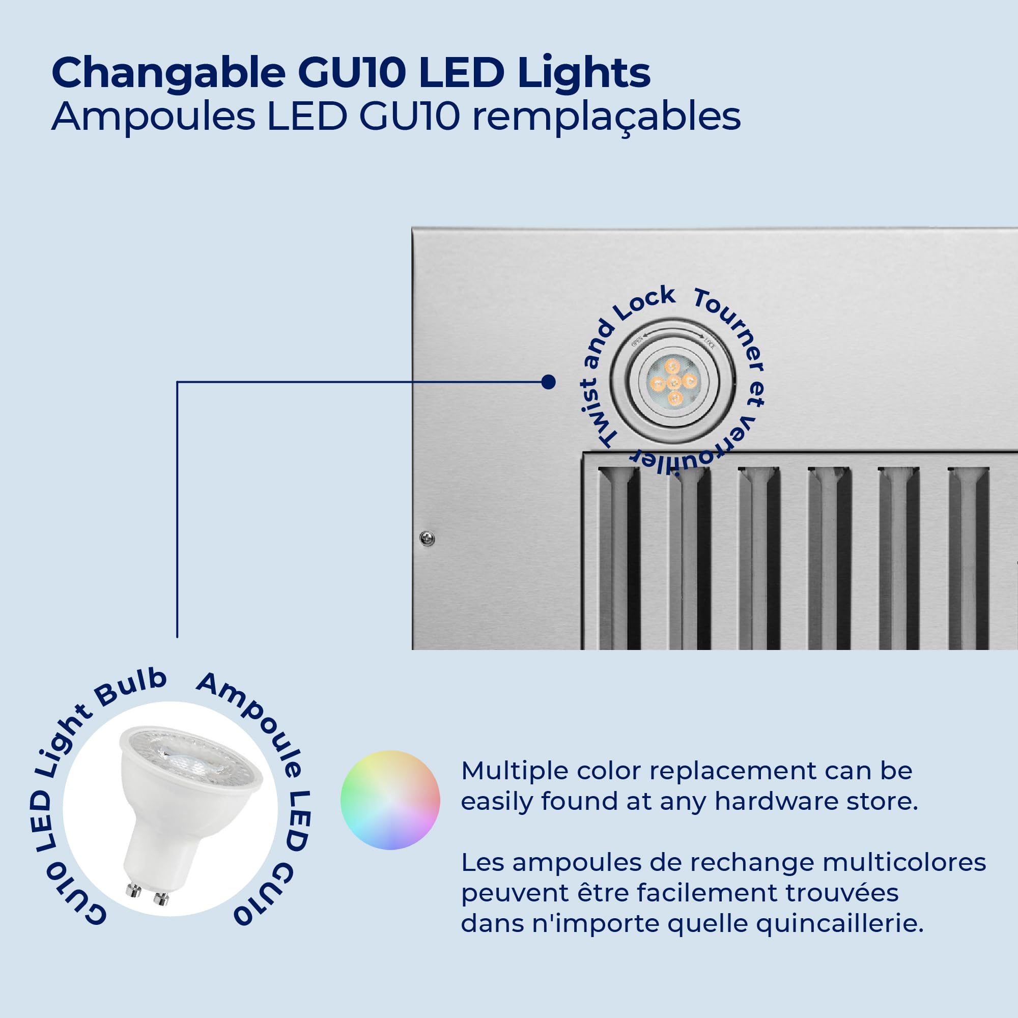 MATCH YOUR KITCHEN LIGHTING: The bright LED lights with GU10 base conserve energy without compromising on light. Unlike other kitchen hoods, you don’t have to request new bulbs from the brand. The GU10 bulbs can be found in any local hardware store, so you can change the light color to coordinate with your kitchen.
