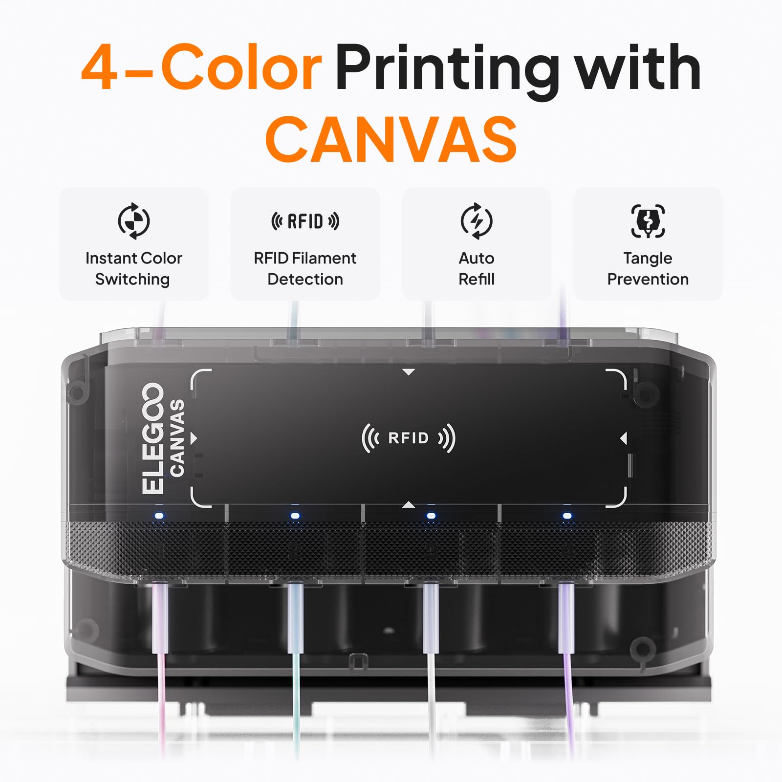 4-Color Printing with CANVAS - Enjoy seamless 4-color printing with the CANVAS system's instant color switching and smart filament detection. Auto refill and tangle detection maintain smooth, hassle-free multicolor printing