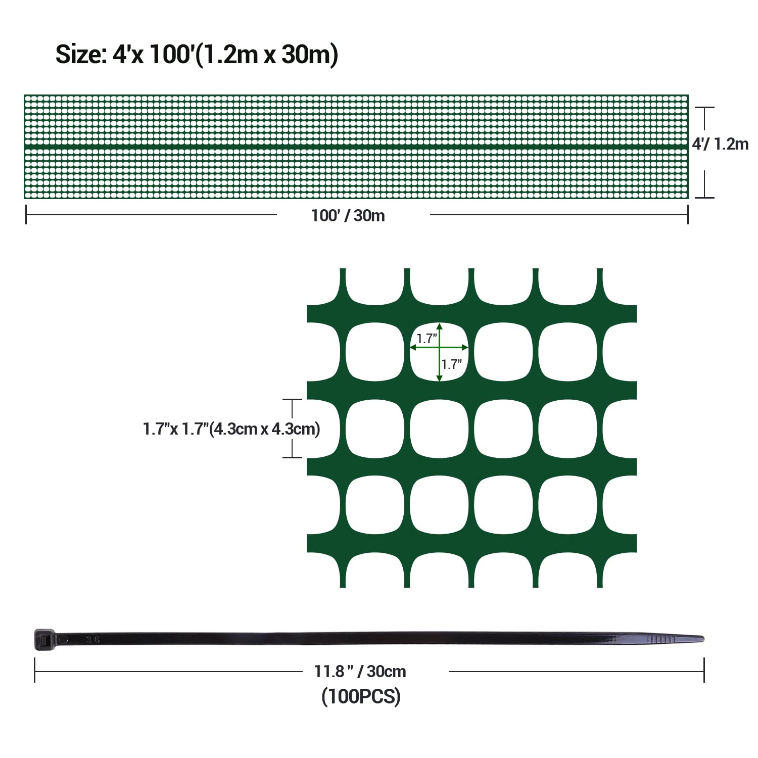 Enliven Your Garden: You've worked long and hard to make your garden as great as it is. Make sure it stays that way with the Ohuhu Green Fence, a 4 × 100 plastic roll that's ready to be set up in whatever configuration you need. The 1.7 x 1.7in mesh openings ensure that there is plenty of airflow and light while keeping out people and animals.