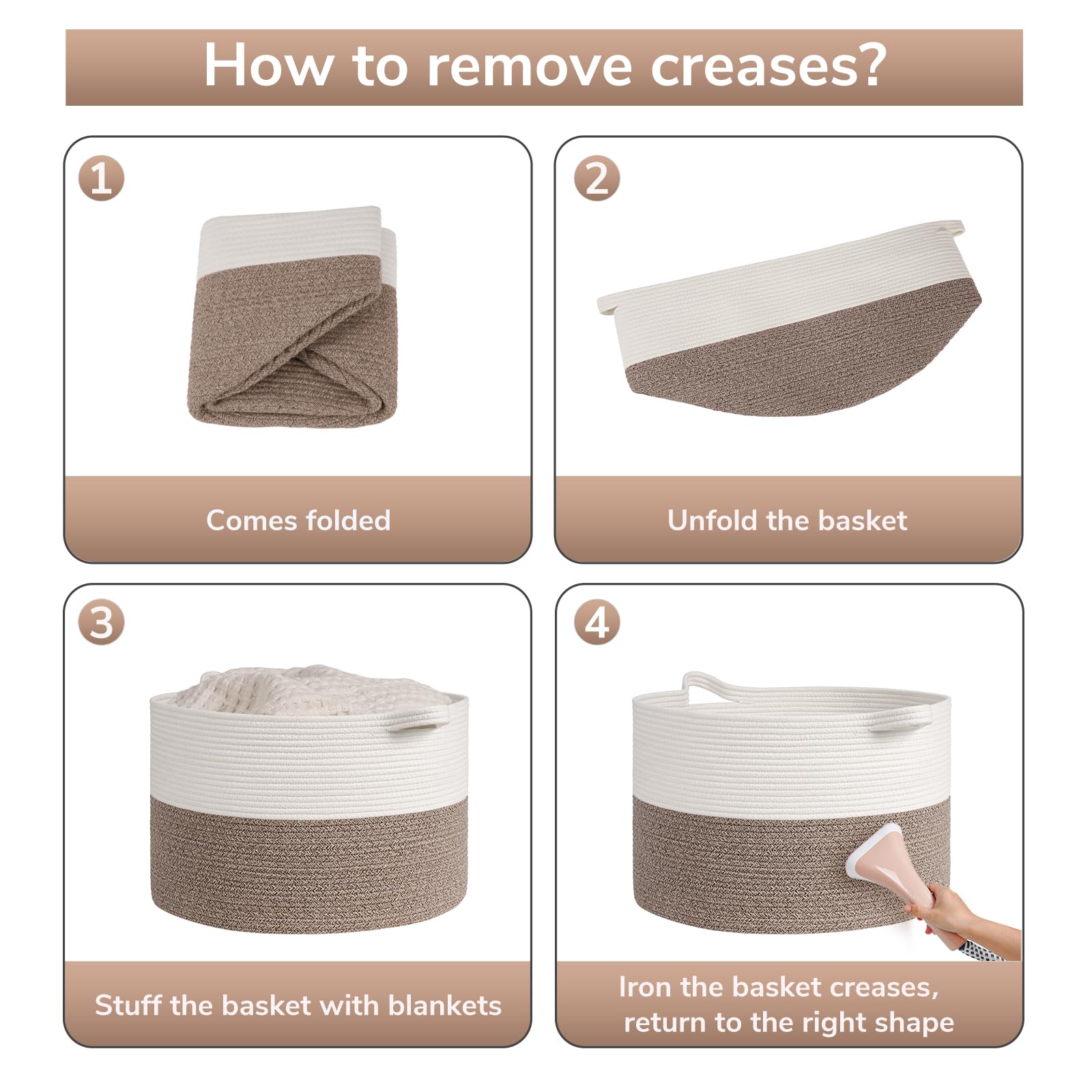 Note: Hand washing or machine washing with gentle detergent. The towel basket comes folded. It’ll return to its best shape while filling blankets and pillows, and ironing is a great idea as well