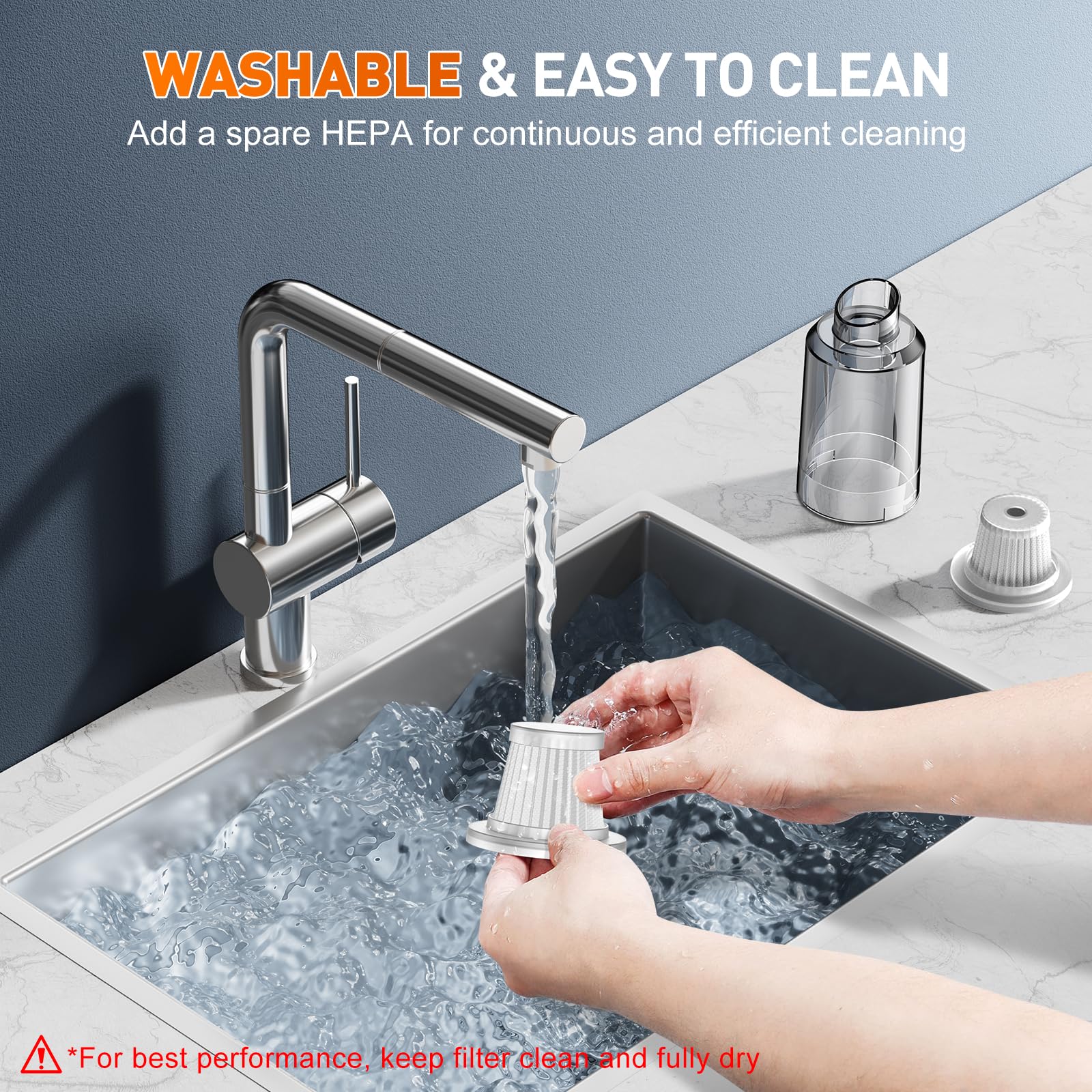 🌟【HEPA FILTER & PORTABLE】The hand held vacuum cleaner is equipped with a washable and reusable HEPA filters, which can effectively filter out tiny particles and dust, ensuring efficient suction while keeping dust and dirt out and preventing damage to the motor. To sustain strong suction, remember to clean the HEPA filter regularly and ensure it is thoroughly dried before reuse. In addition, this mini cordless vacuum cleaner is designed to be lightweight and portable, weighing only 0.82 lb, so it can be easily stored without taking up too much space. The cordless design allows for more flexible cleaning at home or in the car. Its portability also makes it ideal for outdoor activities