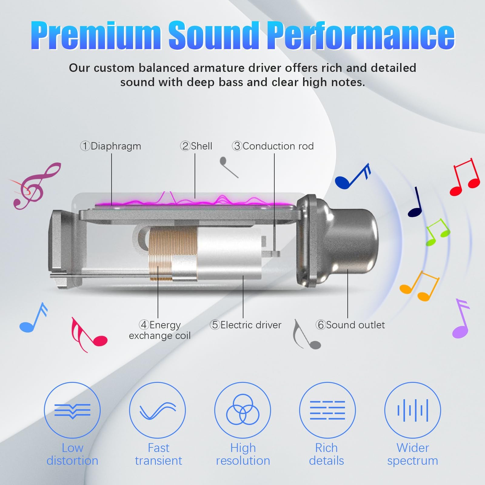 Pleasant Vivid Sound -- These earbuds boast a hybrid design with a single custom-tuned balanced armature driver for each earbud, delivering powerful and vivid stereo sound with deep bass. The aluminum alloy cavity ensures stable audio output without interference from external signals.