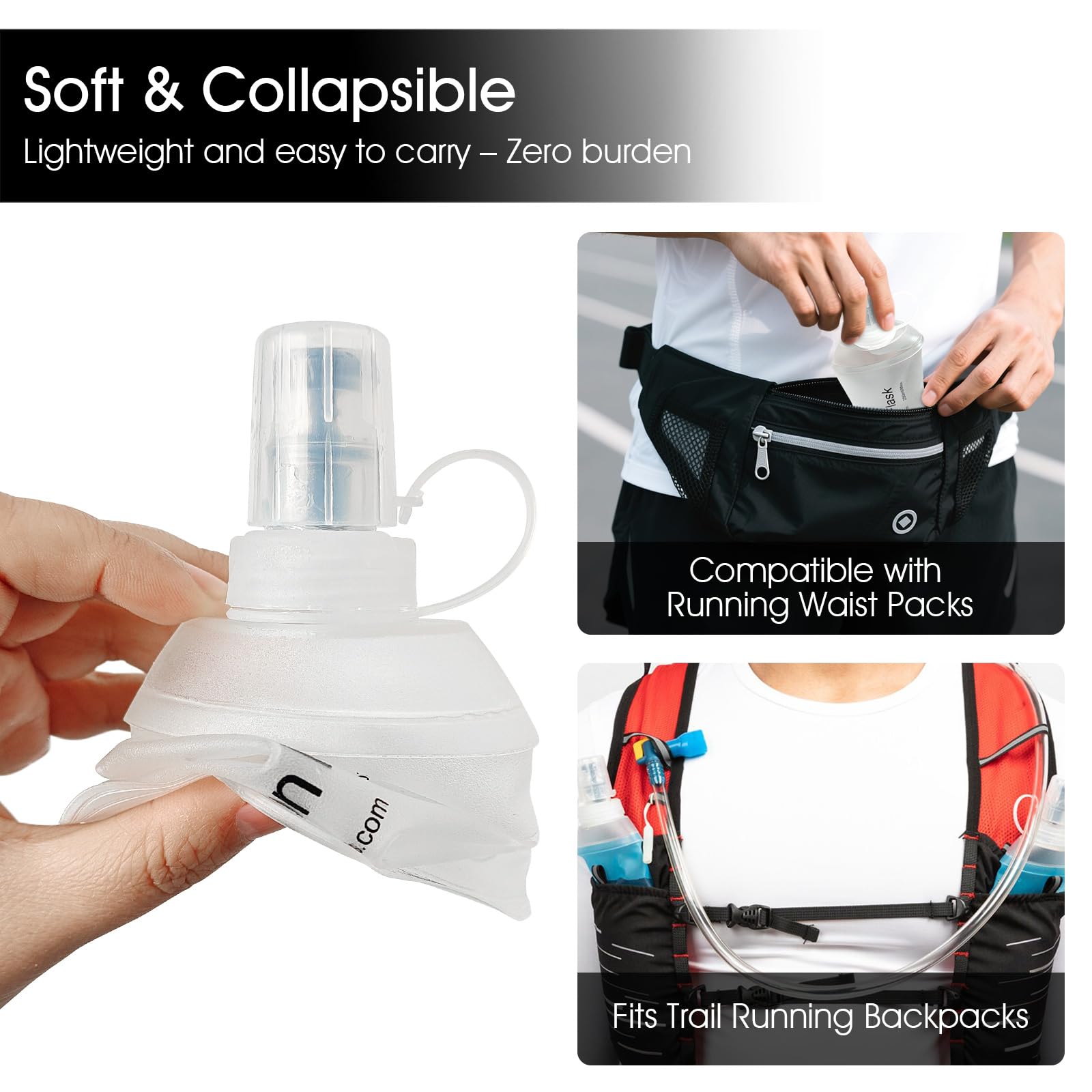 Ultra-Compact and Squeezable Design: Made of food-grade TPU (thermoplastic polyurethane) flexible and lightweight material, BPA & PVC-free, the soft water bottle can be easily collapsed when empty. Its squeezable nature allows you to easily control the flow of water during activities such as running or hiking.
