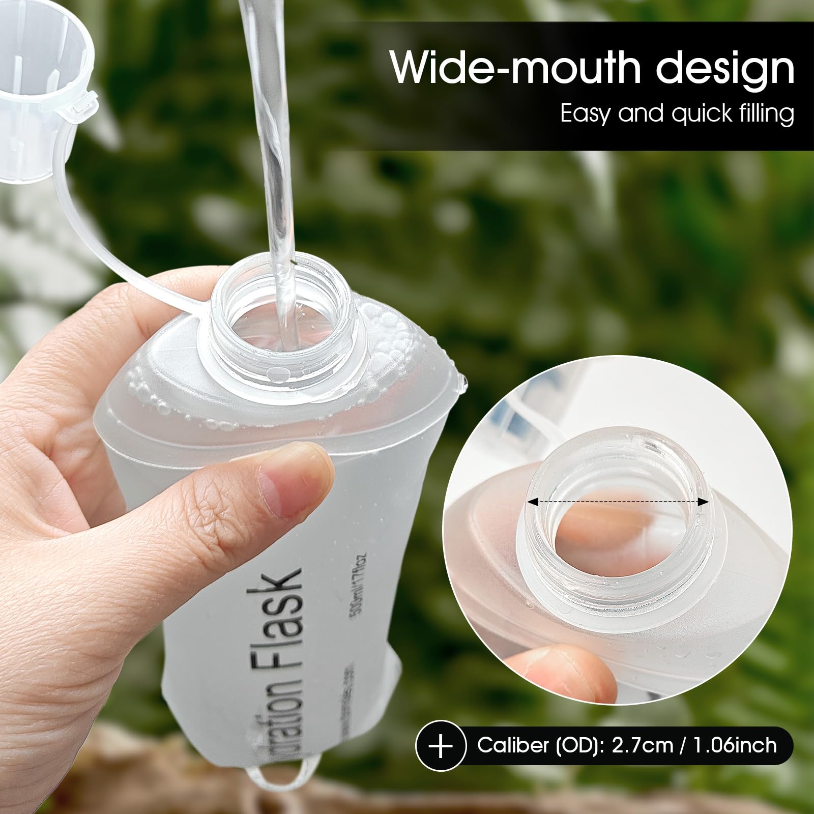 Shrink as You Drink: The flexible material allows the bottle to shrink as you drink, reducing its size and minimizing sloshing. This feature is particularly useful during runs or hikes, as it ensures the flask remains compact and comfortable to carry.
