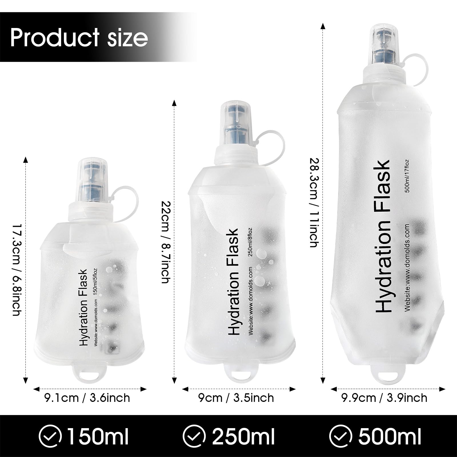 Multi-Capacity: Our soft water flask is available in 3 capacities, 150ml/5 oz, 250ml/8.45 oz and 500ml/16.9 oz, so you can choose freely according to your needs.