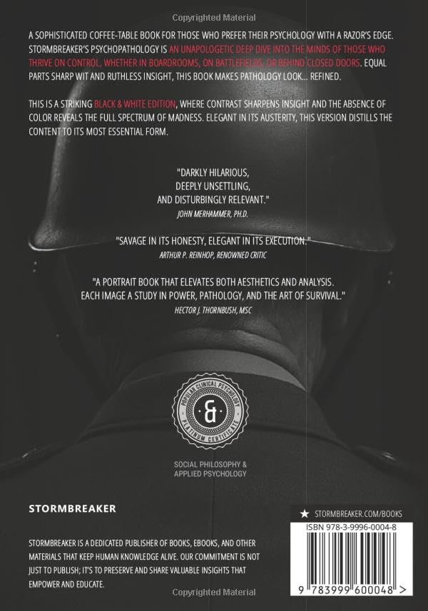 A sophisticated coffee-table book for those who prefer their psychology with a razor’s edge. Stormbreaker’s Psychopathology is an unapologetic deep dive into the minds of those who thrive on control, whether in boardrooms, on battlefields, or behind closed doors. Equal parts sharp wit and ruthless insight, this book makes pathology look… refined. This is a striking black & white edition, where contrast sharpens insight and the absence of color reveals the full spectrum of madness. Elegant in its austerity, this version distills the content to its most essential form.