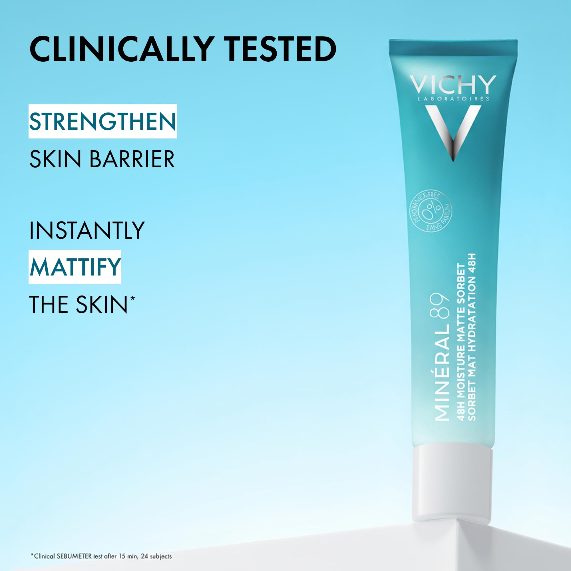 Minéral 89 48H Moisture Matte Sorbet is a refreshing gel moisturizer that provides lasting hydration for up to 48 hours. The lightweight, gel texture glides onto the skin and leaves a mattifying finish with a primer-like effect. Minéral 89 Sorbet feels weightless on the skin, making it the perfect moisturizer for combination to oily skin types. Womens & mens face moisturizer. Suitable for use under makeup as a moisturizing matte face primer. Key Ingredients • Hyaluronic Acid – Hydrates and visibly plumps skin. • Niacinamide – A form of Vitamin B3 that can help retain skin moisture, smooth skin, and restore skin radiance. • Mattifying Powders + Salicylic Acid – Skin care for oily skin helps to mattify the skin and absorb excess oil over time • Vichy Volcanic Water – Strengthens and repairs the skin moisture barrier and protects it from exposome factors such as pollution.
