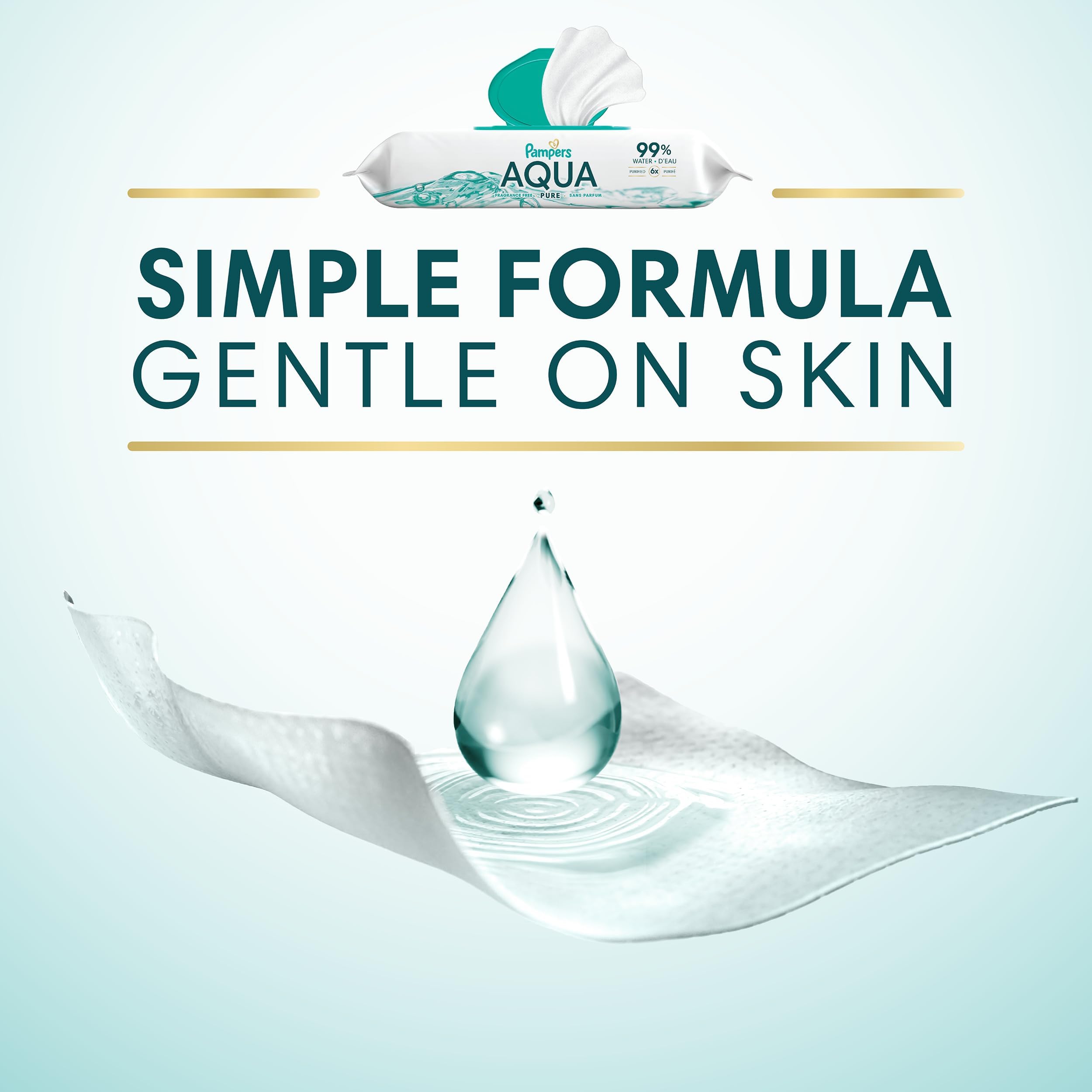 Our simplest formula that families trust, Pampers Aqua Pure baby wipes are made with 99% purified water. These 99% water baby wipes gently clean and help protect sensitive skin. Aqua Pure Baby Water Wipes are perfect for sensitive skin, Aqua Pure water wipes are hypoallergenic and free of alcohol, fragrance, parabens and latex* for a soft and gentle clean. Aqua Pure wipes help restore skin’s pH better than the leading super-premium baby wipe. Plus, each pack includes our handy 1-Wipe POP TOP™, which keeps baby water wipes from drying out. From Pampers, the #1 pediatrician recommended brand. For purely healthy skin, use Pampers Aqua Pure baby wipes together with Pampers Pure Protection diapers. (*No rubbing alcohol and no natural rubber latex). These plastic-free water baby wipes are gentle on the planet, and they’re clinically proven to be kind on baby’s skin, giving parents the confidence to help protect their children in the purest way possible.