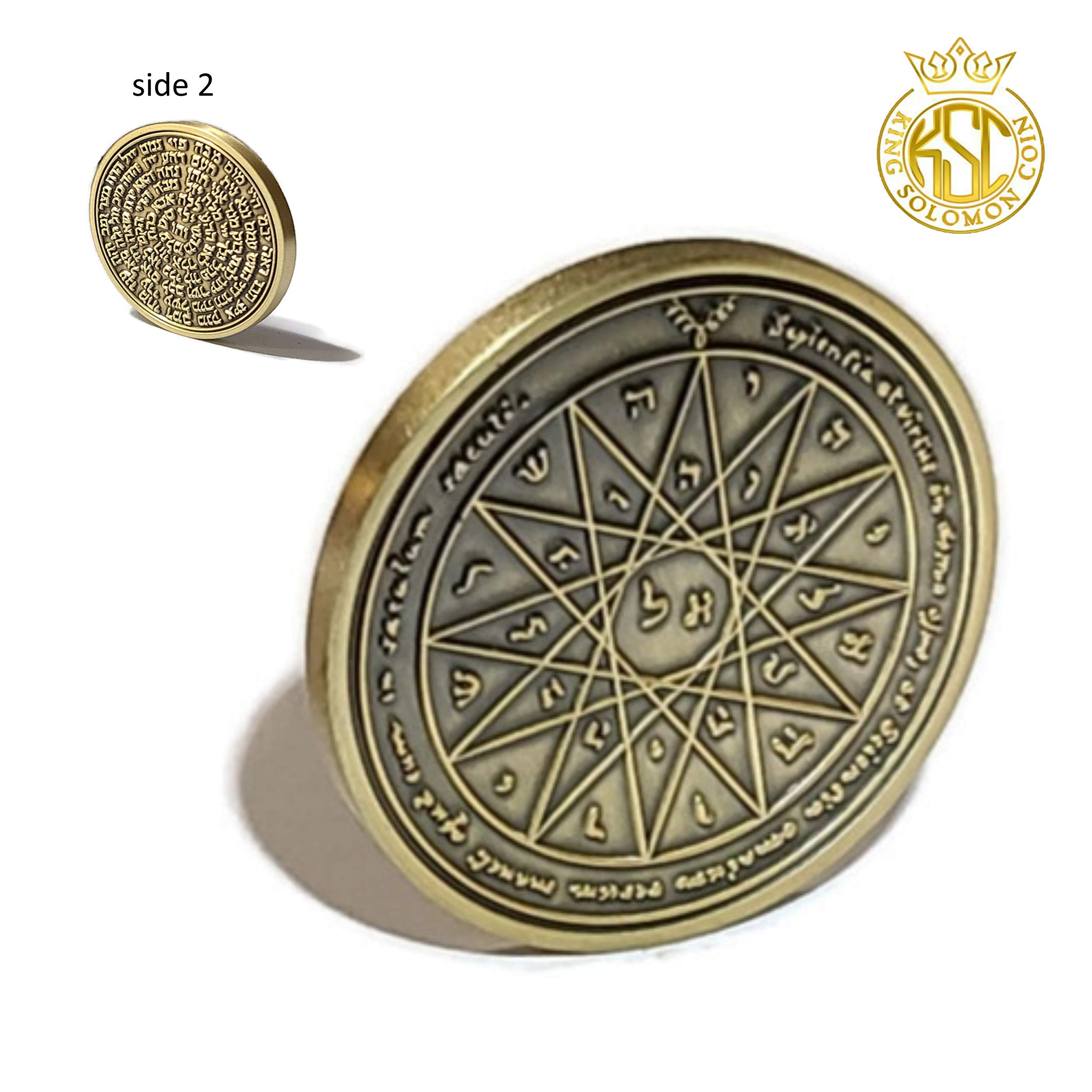 Fourth Pentacle of Mercury (side 1) Assists in gaining knowledge & understanding in all things, and to penetrate the hidden thought of others. This is further proper to acquire the understanding and Knowledge of all things created, and to seek out and penetrate into hidden things; and to command those Spirits which are called Allatori to perform embassies. They obey very readily. In the centre is the Name of God, El. The Hebrew letters inscribed about the dodecagram make the sentence, ‘IHVH, fix Thou the Volatile, and let there be unto the void restriction.’ The versicle is:–‘Wisdom and virtue are in his house, and the Knowledge of all things remaineth with him for ever.’ 72 names of God (side 2) This formula is called the 72 Names of God. 72 sequences composed of Hebrew letters that have the extraordinary power to overcome the laws of nature in all forms, including human nature. The 72 Names are each 3-letter sequences that act like an index to specific, spiritual frequencies. By simply looking at the letters, as well as closing your eyes and visualizing them, you can connect with these frequencies. The 72 Names work as tuning forks to repair you on the soul level. It means, practically speaking, that you don’t have to go through some of the more physically demanding tests in life, you can tune your body and soul with the spiritual frequencies your eyes do not perceive. WARNING: This seal have great energetic forces that can change a person's energy. may cause nausea, dizziness and general weakness in the first 48 hours. Not recommended for pregnant women. Please note: 1. Don't let anyone touch the talisman after you touch it. Because the energy changes. Once a person holds the talisman it belongs to him only. 2. Please do not enter the bathroom/restroom with the talisman because of the holy symbols and the name of God on it. Size 1.50 inches thick 2.9 millimeters Weight 0.8 oz Material Alloy/Brass Color Gold PVC coin sleeve