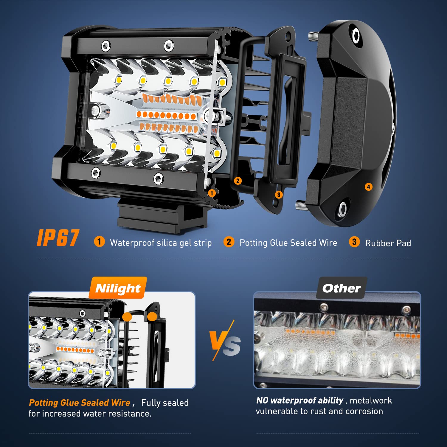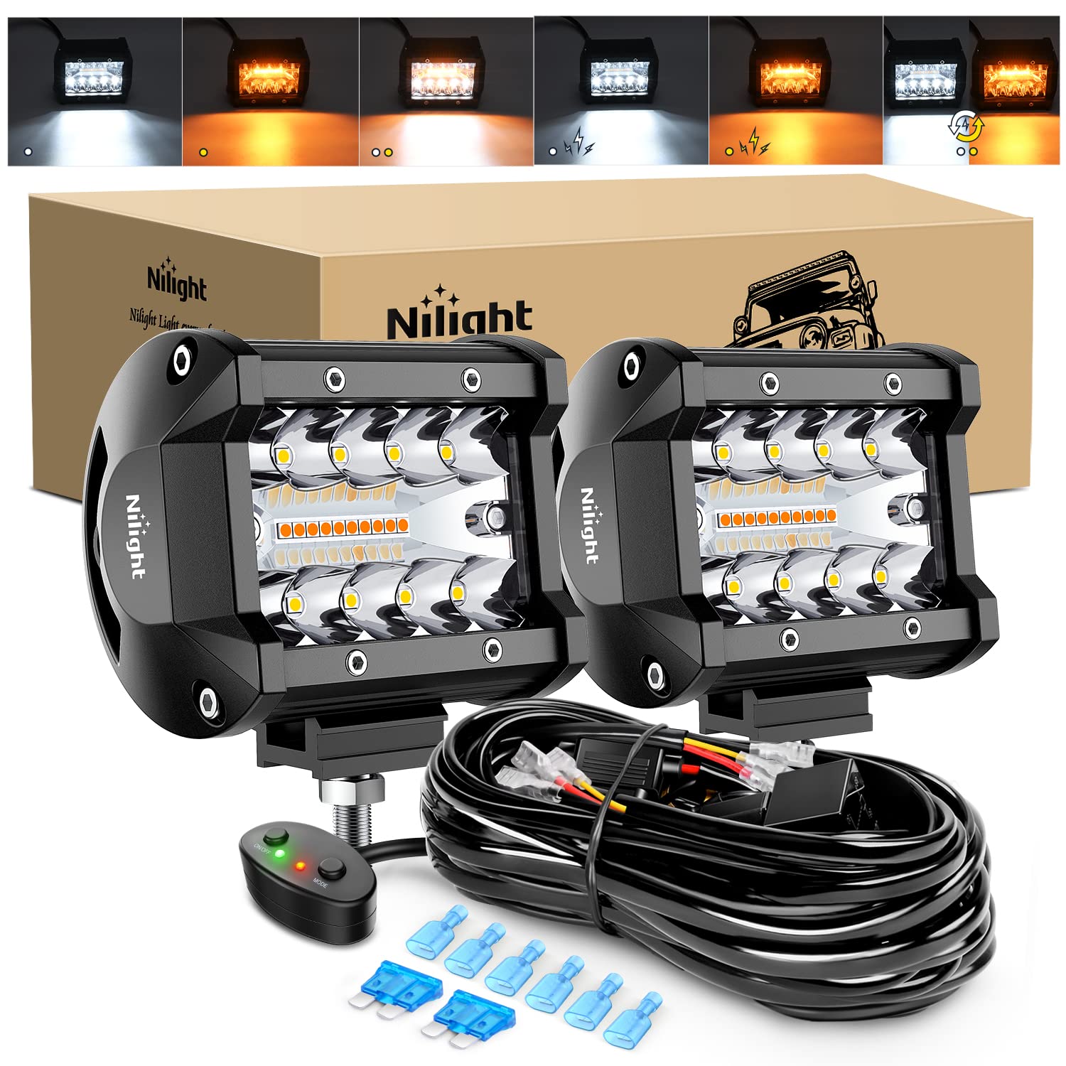 6 Modes with Memory Function: Regulate mode in turn by switch of the lights(white/amber/white & amber/white strobe/amber strobe/ white & amber strobe). The light bar will remember the mode you last used, you won't be annoyed by switch-mode frequently. It's great to use for warning lights, fog lights, driving lights, or work lights. Come with NILIGHT upgraded version wiring harness kit
