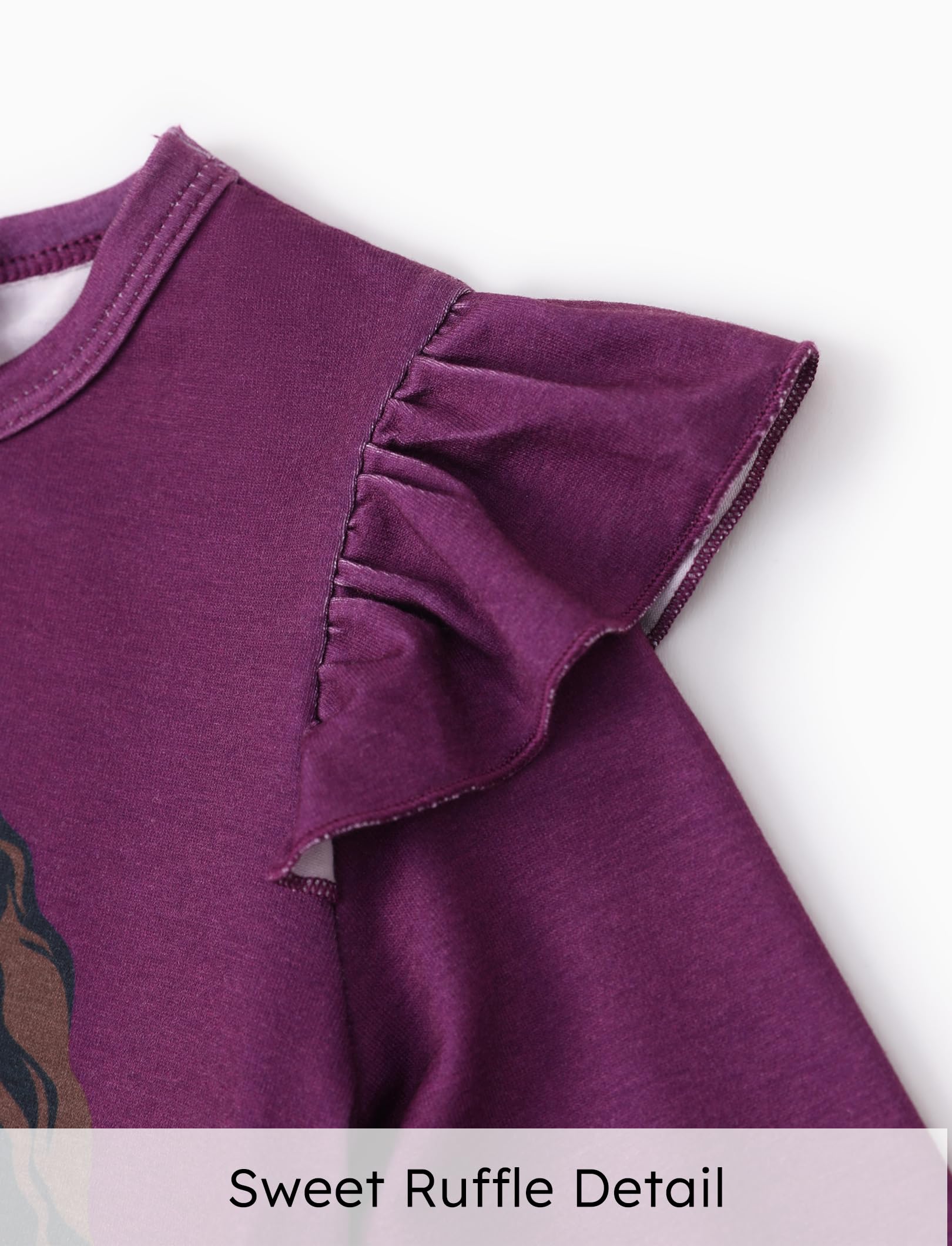 Charming & Playful Design: This Moana outfit for girls features ruffled flutter sleeves and a large, colorful graphic of Moana hugging her friend Pua, surrounded by vibrant tropical flowers. The long-sleeve pullover top pairs with coordinating leggings in a Polynesian-inspired geometric print for a fun, adventurous island vibe. Can be paired with other Moana shirts for girls or Moana clothes for girls for mix-and-match fun