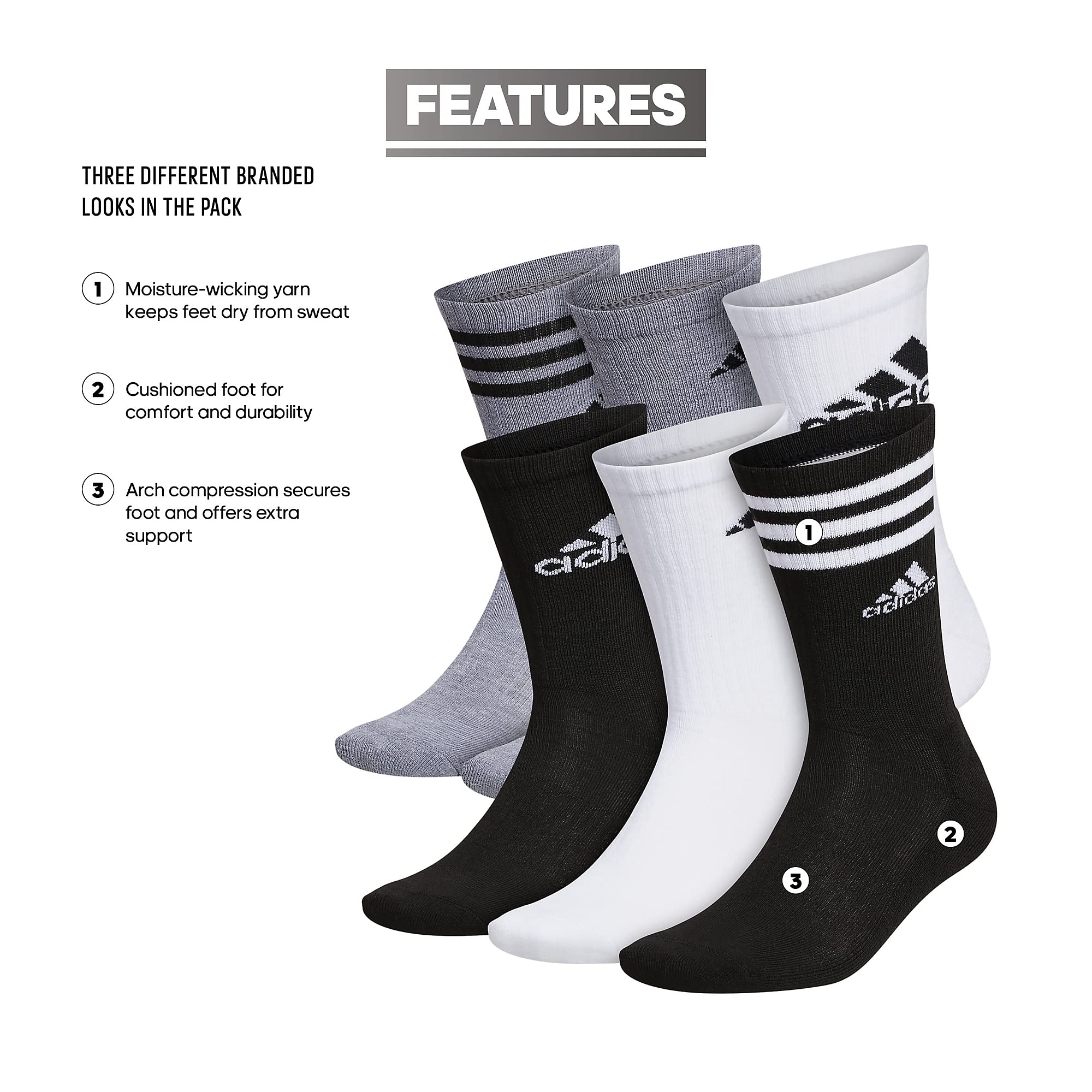 Description Discover a blend of comfort and performance with adidas Men's Athletic Cushioned Crew Socks. These mens socks come with arch compression for a secure fit, making them ideal as arch support socks. Whether you're searching for running socks men or long socks for men, this six-pair pack offers versatility and durability. Crafted from moisture-wicking yarns, these athletic socks for men keep feet dry, giving a comfortable experience all day. The cushioned foot provides extra comfort, while the secure fit supports daily activities, making them suitable as men socks. Experience comfort with a thoughtful design and durability to support your active lifestyle. Whether for everyday wear or intense athletic routines, adidas delivers quality mens socks to meet every demand.