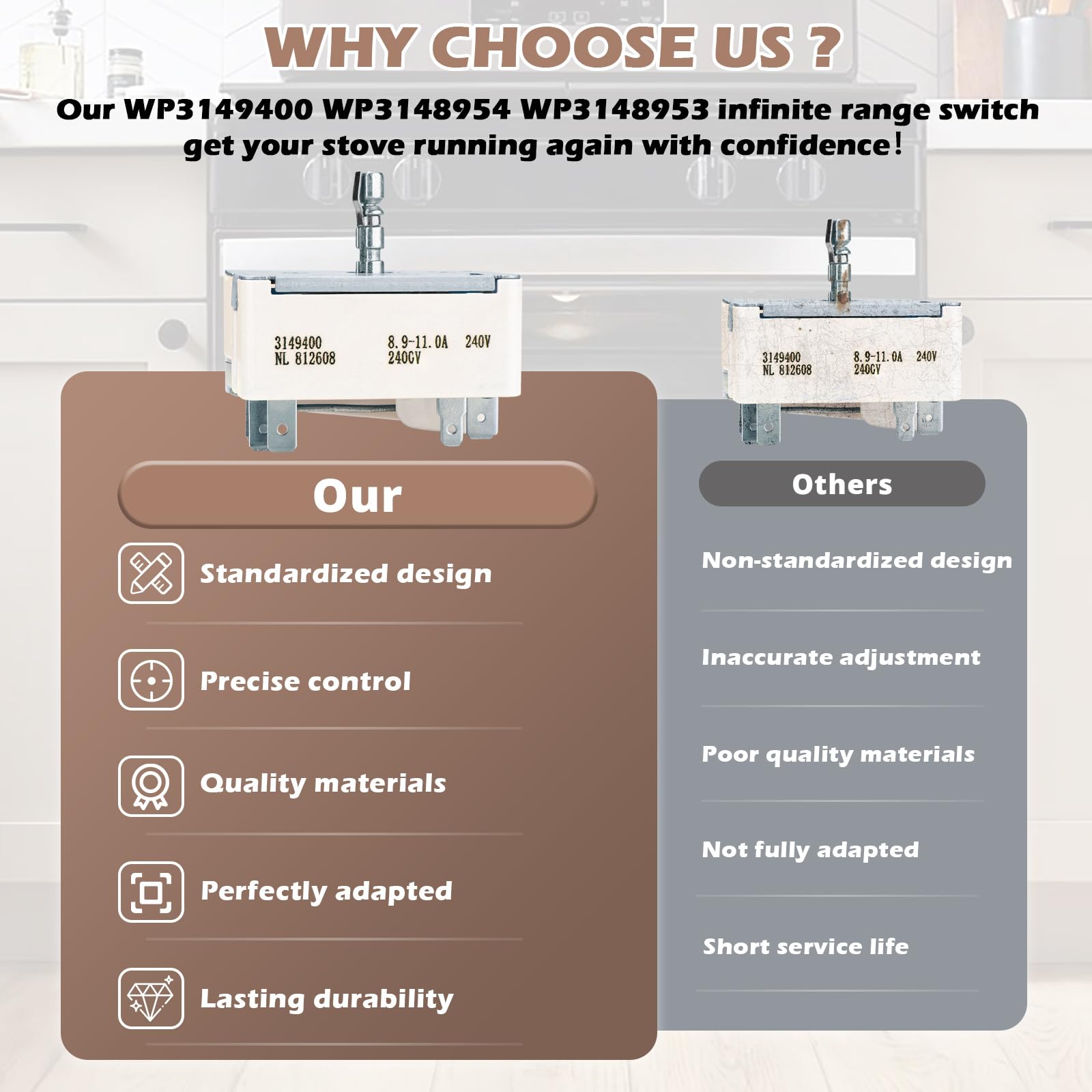 Stepless Heat Control:As a professional infinite control switch, the 3148954 enables smooth, stepless heat adjustment (from low simmer for soups to high boil for pasta). It maintains consistent temperature during cooking, avoiding overcooked or undercooked meals—ideal for daily use, baking, or heavy-duty cooking.
