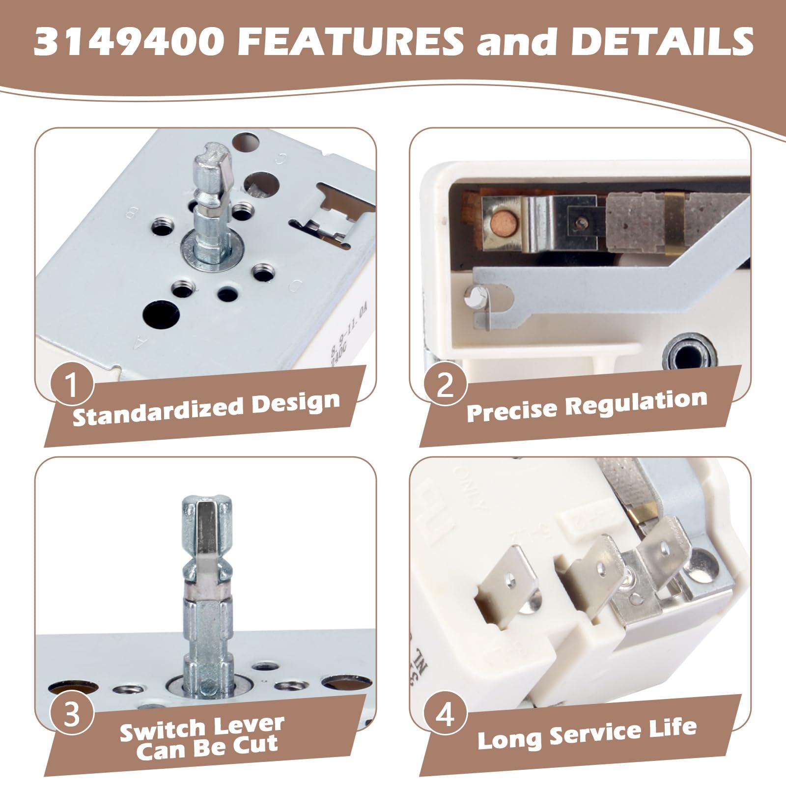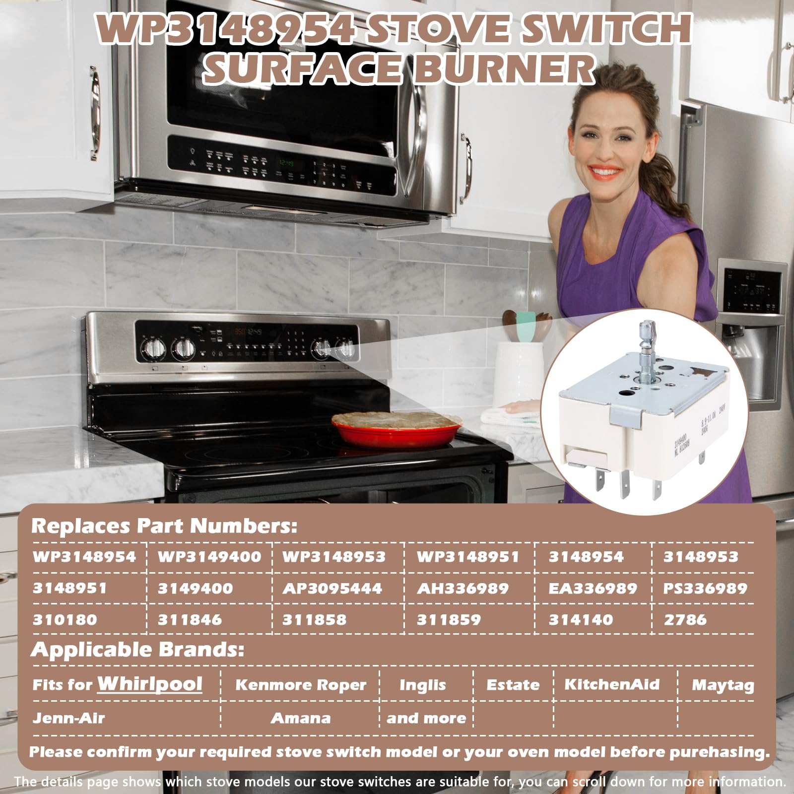 Wide Compatibility:Replacement for OEM part #3149400, and also replaces multiple alternative part numbers: WP3148954, WP3149400, WP3148953, WP3148951, AP3095444, 310180, 311846, 311858, 311859, 314140, 2786, AH336989, EA336989, PS336989 (and more). This switch perfectly fits Whirlpool, Kenmore, Maytag, Roper, Inglis, Estate, KitchenAid, Jenn-Air, Amana gas/electric ranges/ovens—just confirm your appliance model number first for a seamless, like-new fit.