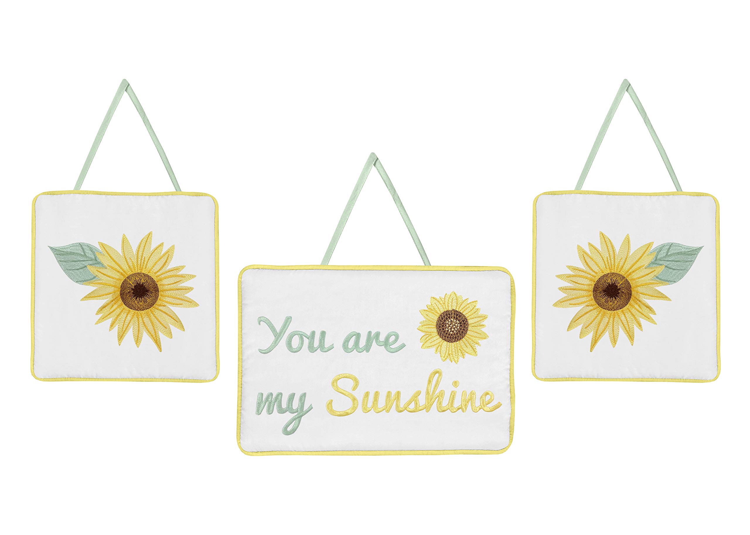 This set boasts a hand painted watercolor sunflower print, a coordinating leaf print, and solid fabrics.