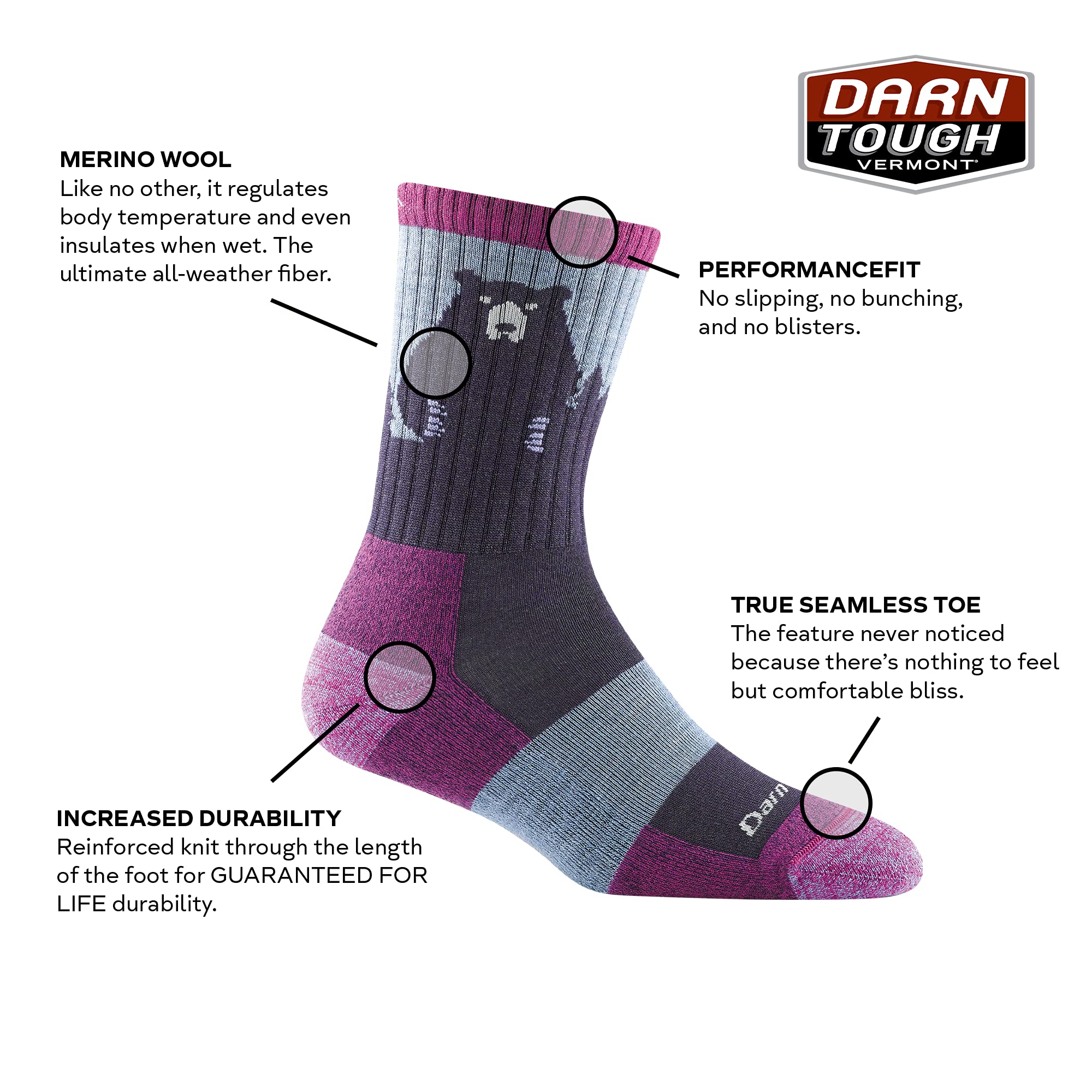 Description Embrace comfort and versatility with the Darn Tough Bear Town Micro Crew Lightweight Sock with Cushion. Designed for all-day wear, these socks feature a lightweight construction with a thin layer of cushioning along the base of the foot, providing just the right amount of support without unnecessary weight. The micro crew height sits just above the top of a standard hiking boot, offering an ideal fit for both outdoor adventures and everyday activities. True Seamless technology ensures an ultra-smooth, invisible feel by eliminating irritating seams, so you can focus on the journey ahead. Made with a premium blend of 54% Nylon, 43% Merino Wool, and 3% Spandex, these socks are breathable, fast-drying, and naturally odor-resistant. The Merino Wool keeps your feet dry and comfortable in any weather—cool in the summer and warm in the winter. Proudly knit in Vermont, USA, the Bear Town Micro Crew Lightweight Sock with Cushion combines exceptional craftsmanship with all-weather performance, making it the ultimate choice for durability and style on or off the trail.