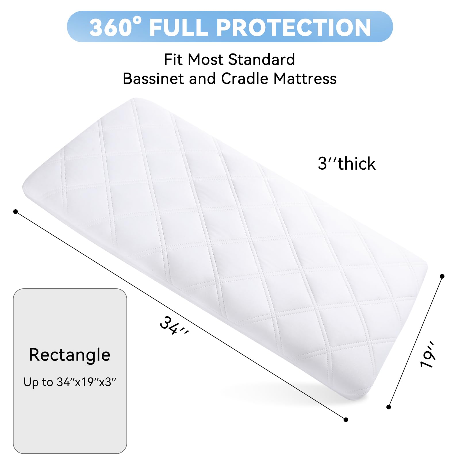 🌙FLEXIBLE FIT - Measures 34''x19'', designed specifically to almost all standard rectangle shaped bassinet mattress and beside sleepers. Deep pockets make sure the mattress cover universal fit mattress up to 4 inch thick.