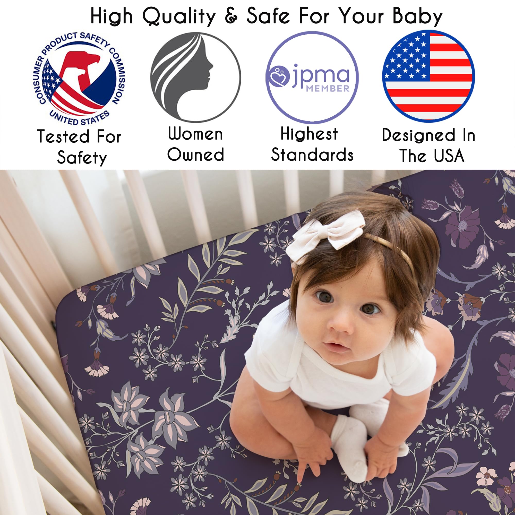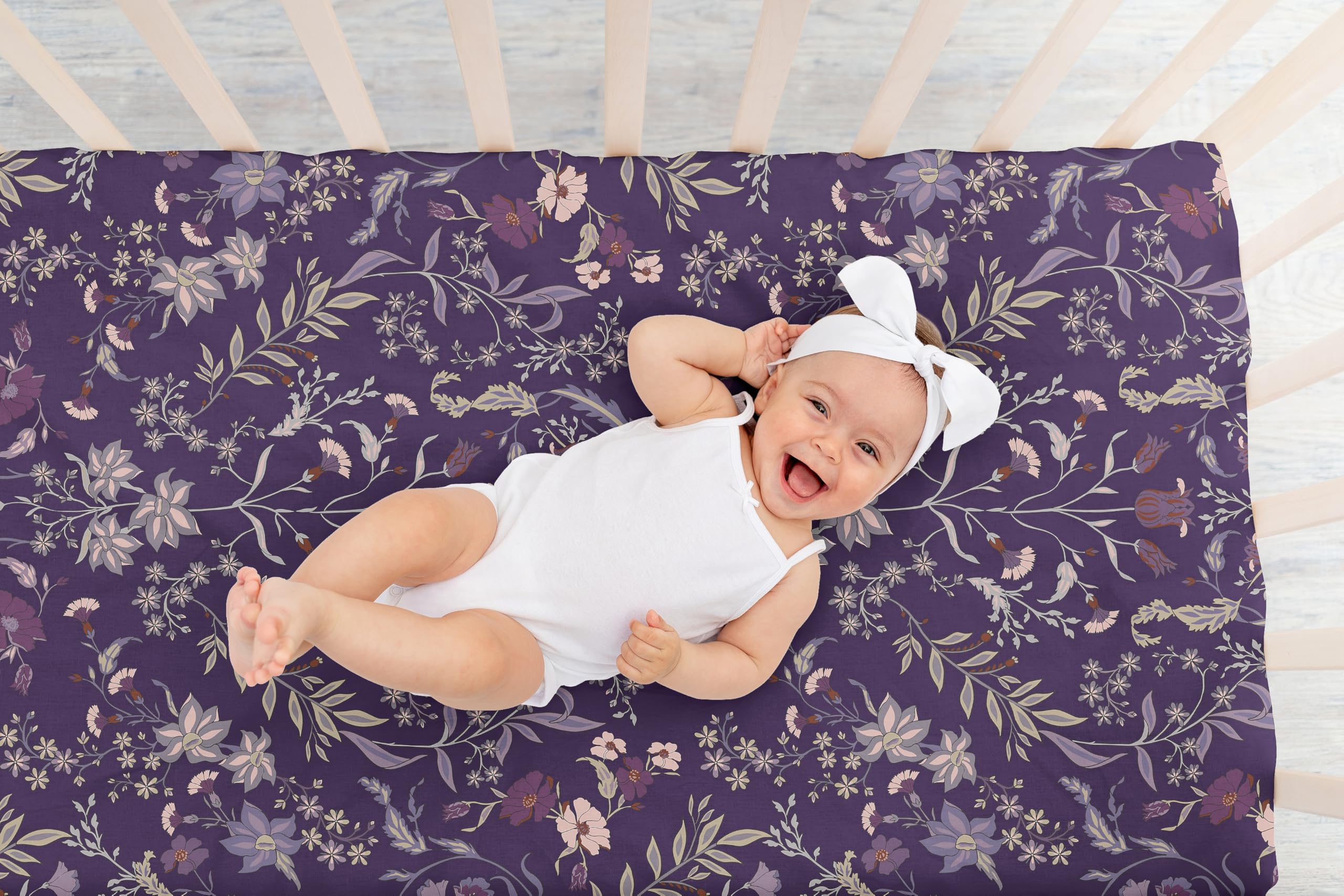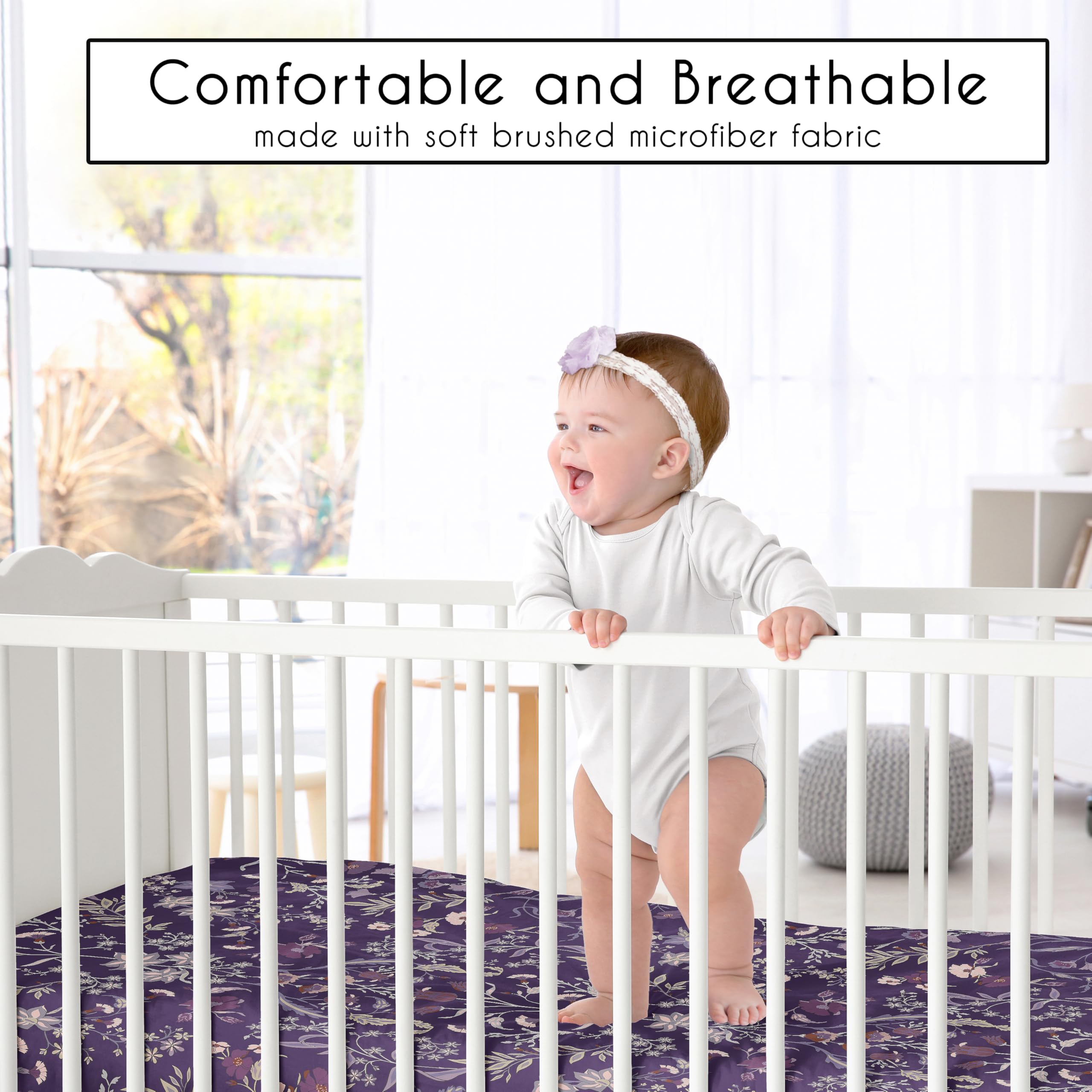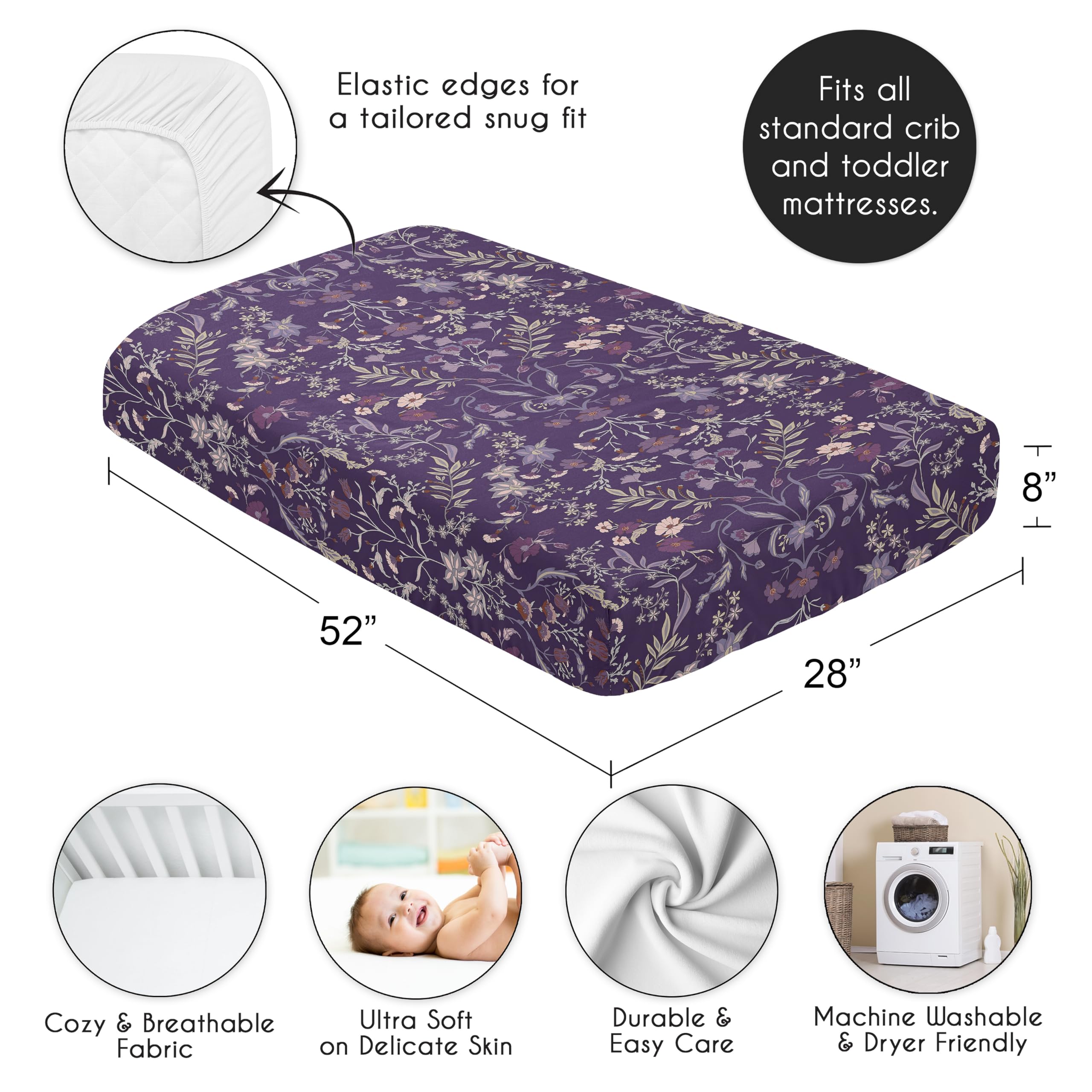 SNUG FIT: Includes (1) Fitted Crib Sheet 52in. x 28in. x 8in. Our newborn standard crib sheets fit snugly, with premium elastic sewn around the entire bottom edge for a secure fit on most standard sized cribs and toddler beds, to reduce shifting and bunching. This brushed microfiber crib sheet features an exclusive design of a plum, lavender, teal, turquoise & lilac botanical leaf, garden, rustic, daisy leaves wild floral print & is gentle on delicate skin to foster a soothing sleep environment.