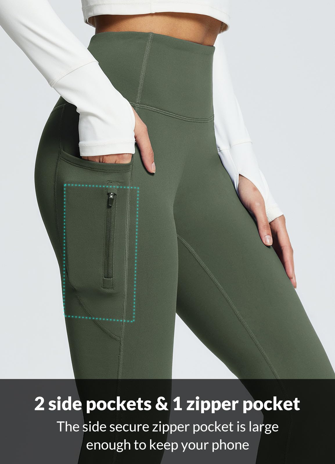 Feel the cold? Put on these fleece lined pants. These high waist yoga pants with pockets with soft fleece lining keep you super comfy and warm under 50°F, the water-resistant fabric is outside to better keep from wind and keep you dry on a snowy day.