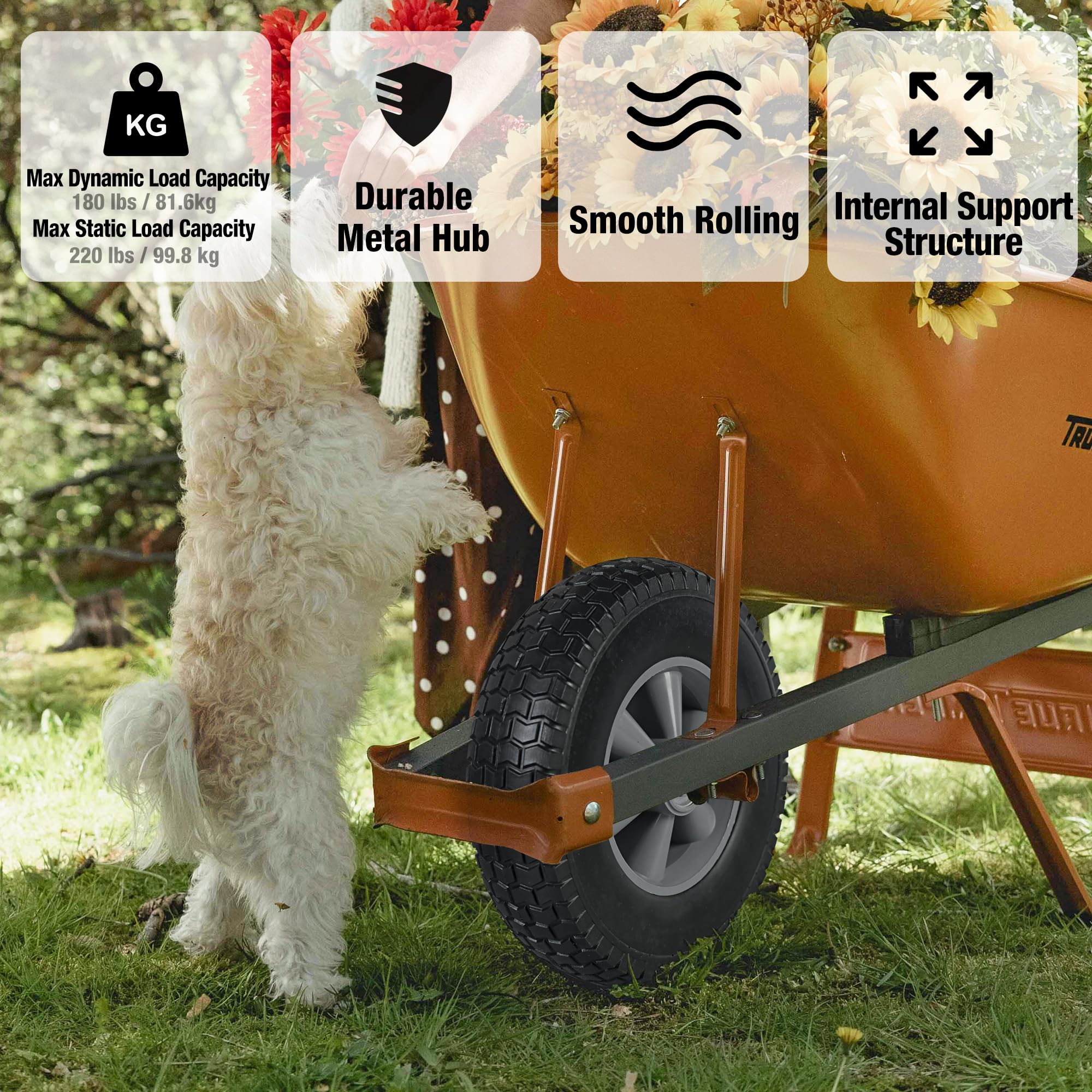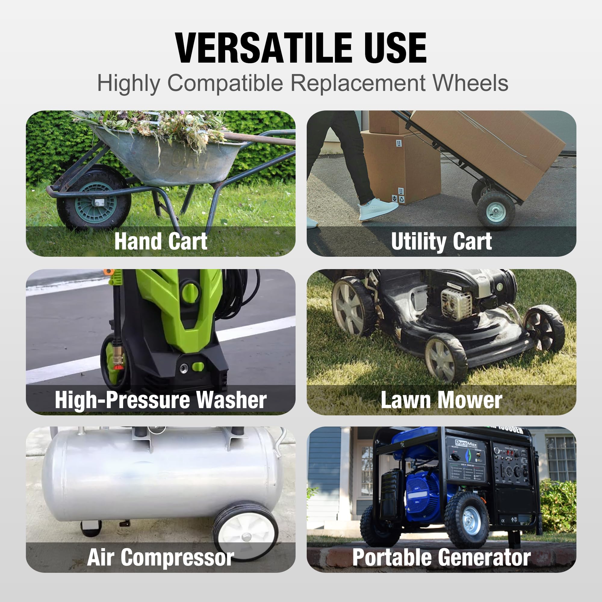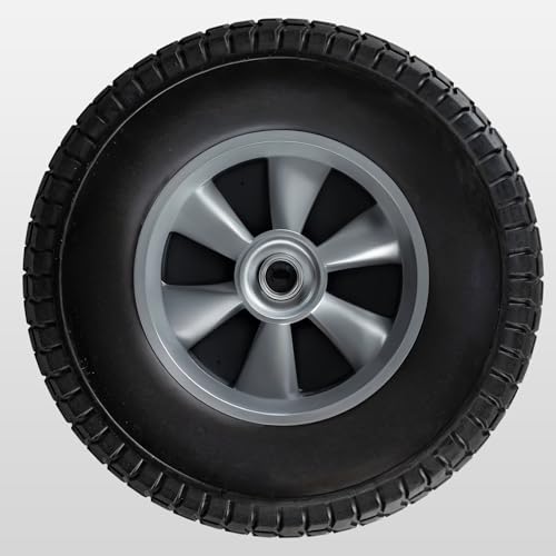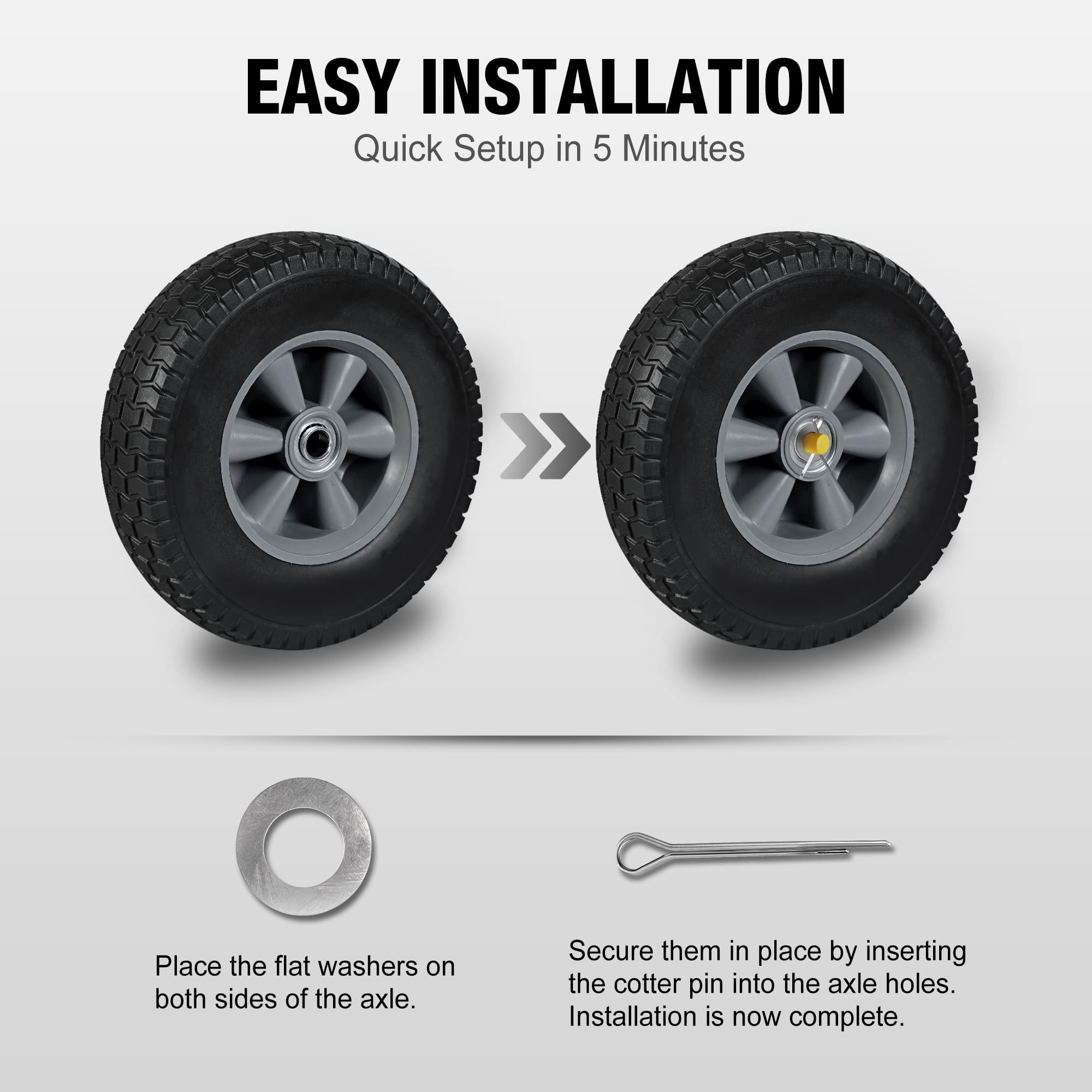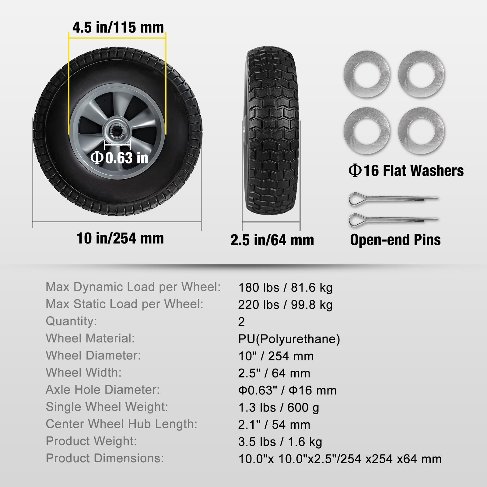 BIG RED Torin 10-Inch solid rubber tires with 360lb PU wheels- These solid PU wheels with sturdy plastic hubs boast a whopping 360 lbs dynamic load and a static limit of 440 lbs. Dual-sealed bearing shafts keep the surface smooth to prevent dust and water. This 2-pack set is perfect for replacing tires on your towing and transport equipment. Made from high-rebound PU material with extra-wide 2.5"/64 mm tires and deep tread patterns, these solid wheels grip like a pro. Say goodbye to slipping and sliding, even on those rough, unpredictable terrains. With the solid construction, you don't have to worry about tire punctures or air leaks. Thanks to the added internal support component, these solid PU tires won't go flat and are difficult to recover from prolonged use. They are also less prone to developing annoying flat spots on bumpy terrain. They bounce right back! These 10" tubeless solid tire wheels fit perfectly on hand trucks, dollies, trolleys, wheelbarrows, yard tractors, snow blowers, high-pressure washers, air compressors, and more! It's like giving your equipment an instant upgrade! Don’t wait for another flat tire! Convert now to a more reliable and durable flat-free tire. nstalling these solid run-flat tire wheels is a breeze! Just install the flat washers and open-end pins on both sides of the axle, tighten them, and you're good to go. Replacing worn-out tires has never been this simple.