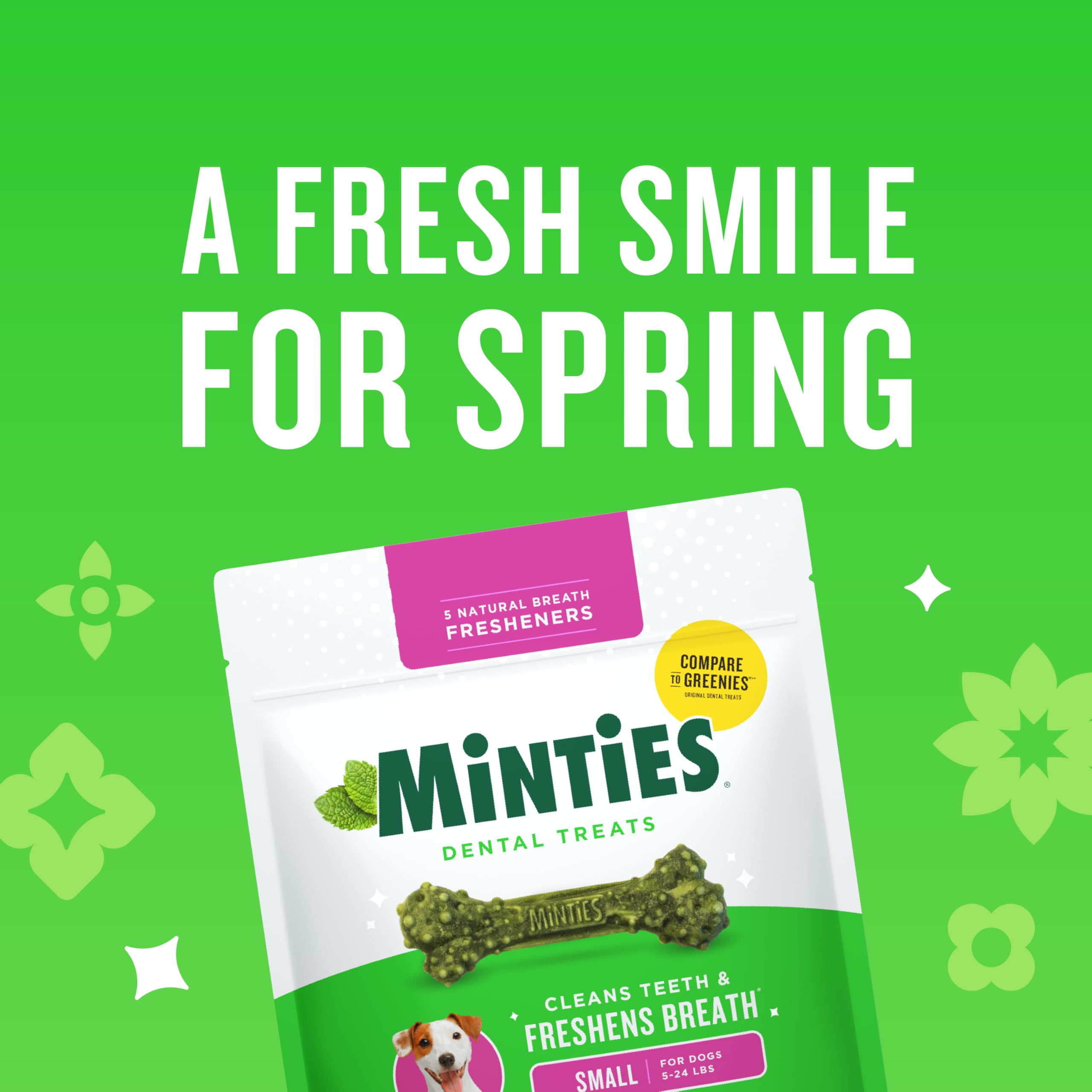 Say hello to Minties, the dental treats that make oral care fun for your dog! Designed to freshen breath and promote dental health, Minties are crafted with 5 natural breath fresheners—peppermint, parsley, fennel, dill, and alfalfa. Plus, these dental treats for dogs are made without corn, wheat, soy, and added sugars or salts, to be extra gentle on sensitive tummies. Each of these dog breath treats features a unique shape and bumpy texture that help to scrub teeth as your dog chews! Veterinarian recommended and proudly made in the USA, Minties dental treats for dogs come in different sizes (small, medium, large) to suit dogs of all ages and breeds. Whether given daily or as an occasional after-dinner breath freshener, Minties dental chews for dogs are a tasty way to support your dog's oral hygiene routine and dog dental care. Minties are a wholesome choice that dogs love and owners trust for maintaining fresh breath, sparkling smiles, and overall dental wellness.