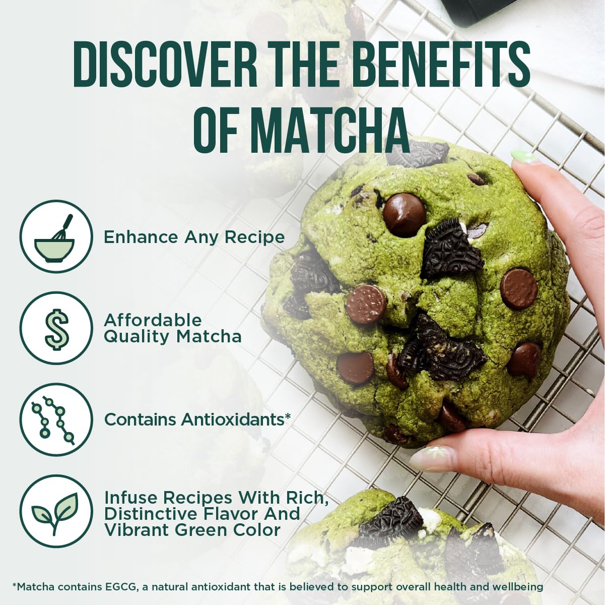Matcha contains a class of antioxidants called Catechins, particularly epigallocatechin gallate (EGCG), believed to help prevent free radicals in the body.