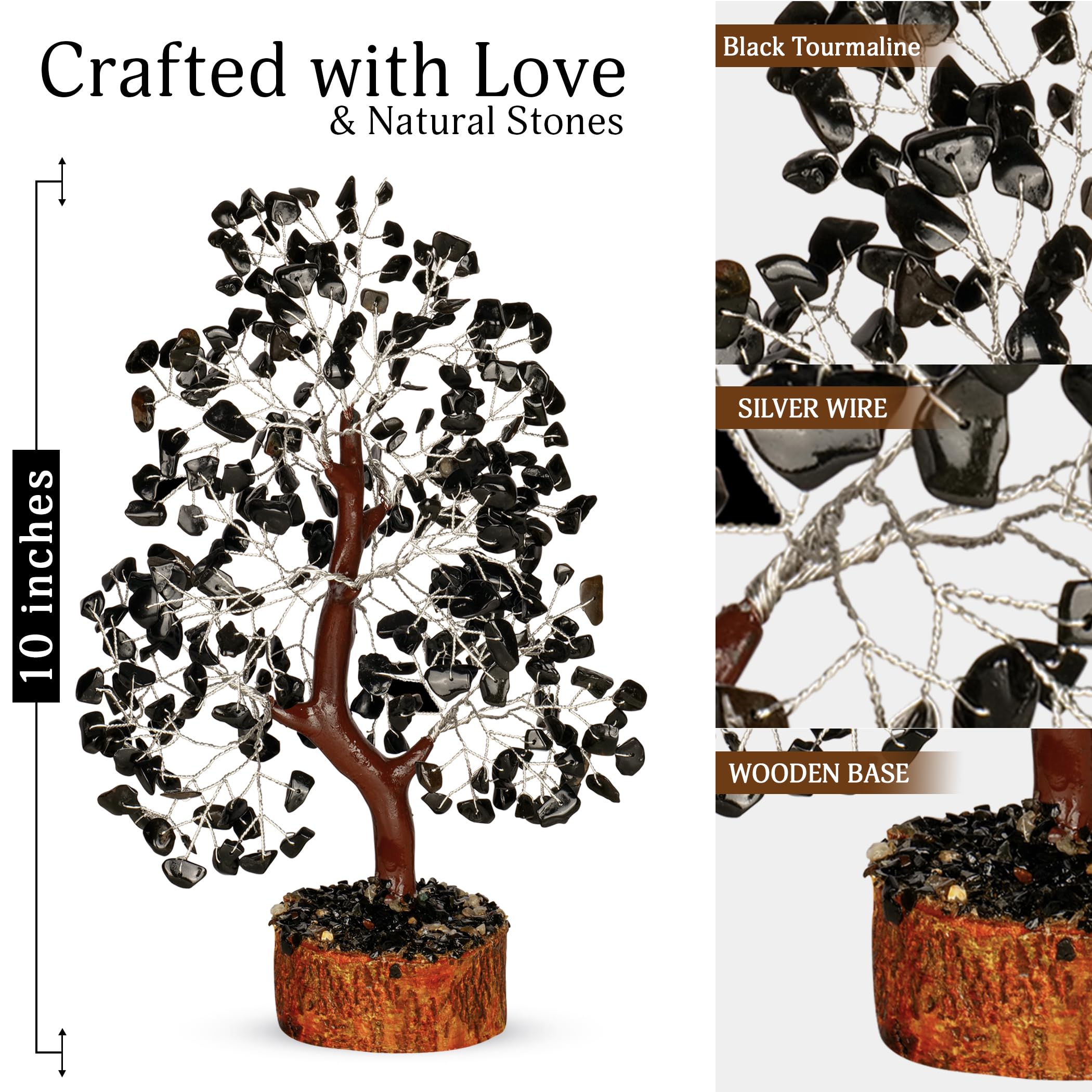 Black Tourmaline Bonsai Tree - This reiki chakra healing tree is beautifully handcrafted with black tourmaline gemstone chips, the base of this crystal chakra tree is made up of wood. The middle portion of this prosperity tree is made of mseal, branches of the prosperity tree are made by silver wire. The gemstone crystals are embedded into the wire, as the wire is foldable, so you can change the look of your chakra tree. This prosperity tree is approx 10-12 inches
