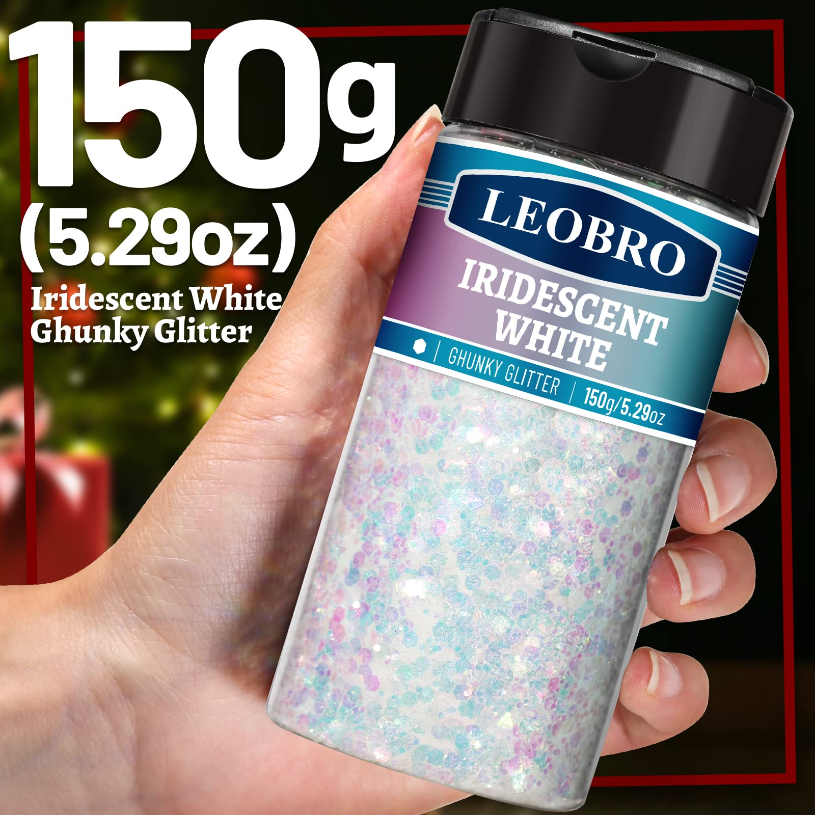 Iridescent White Chunky Glitter: Net weight: 150g/5.29oz, big bottle of craft glitter, supports a wide range of DIY projects, resin art crafts, holiday decoration making, nail art design, makeup, DIY glitter paint etc.. Gorgeous shiny iridescent white glitter, along with secondary rainbow color, shines stunningly under light.
