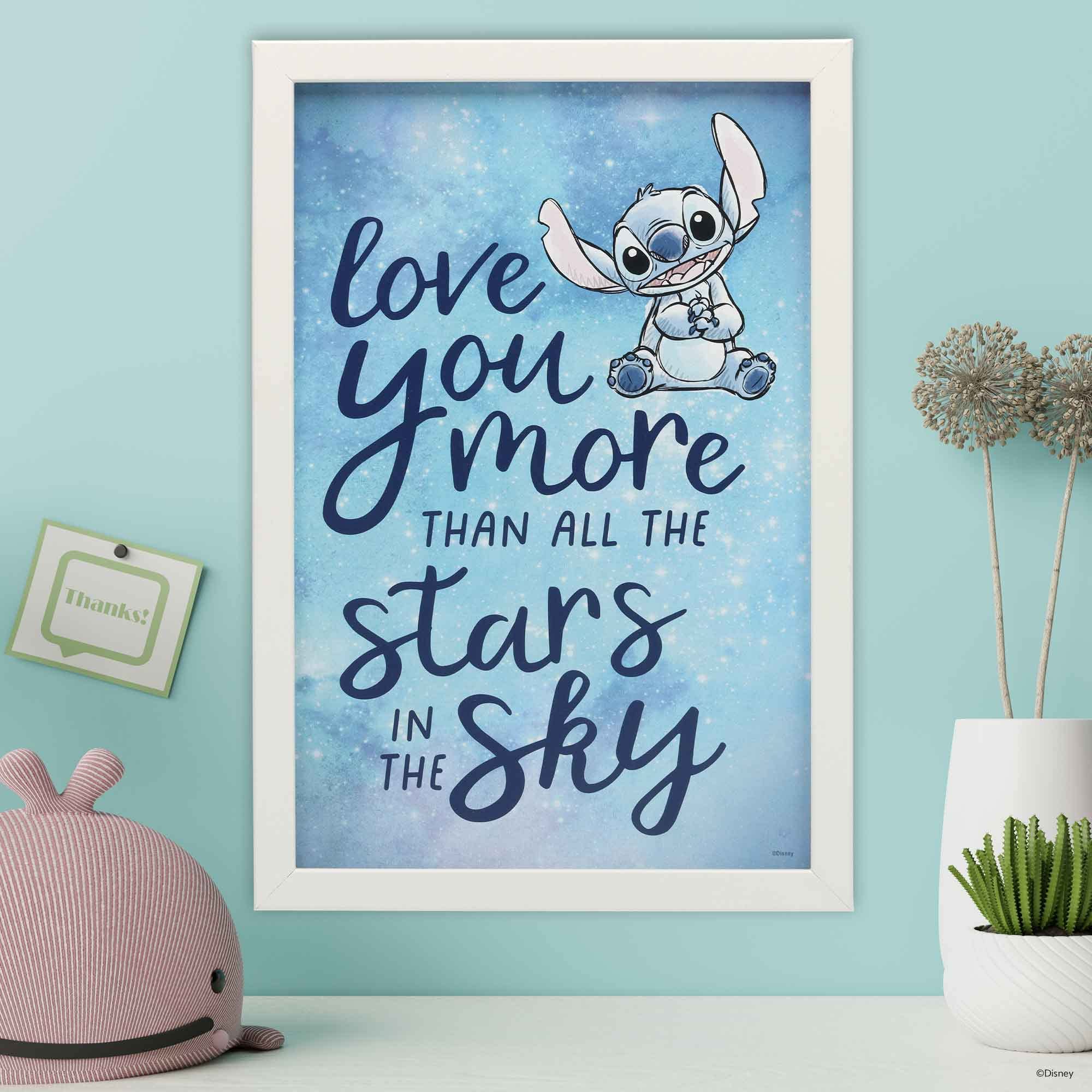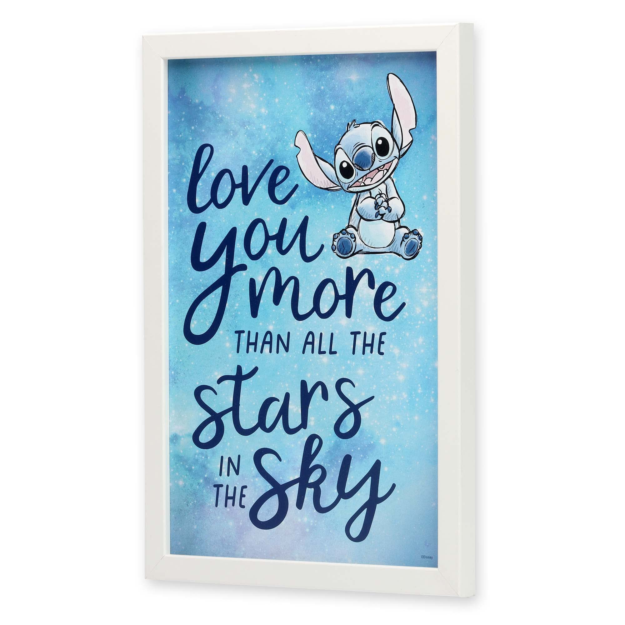Framed Wood Wall Decor: Against a starry blue background is an illustration of a smiling Stitch and the phrase, "Love you more than all the stars in the sky" in gorgeous typography styles. Display this lighthearted wall art alongside other Disney decor to give your child the most whimsical and personalized space!