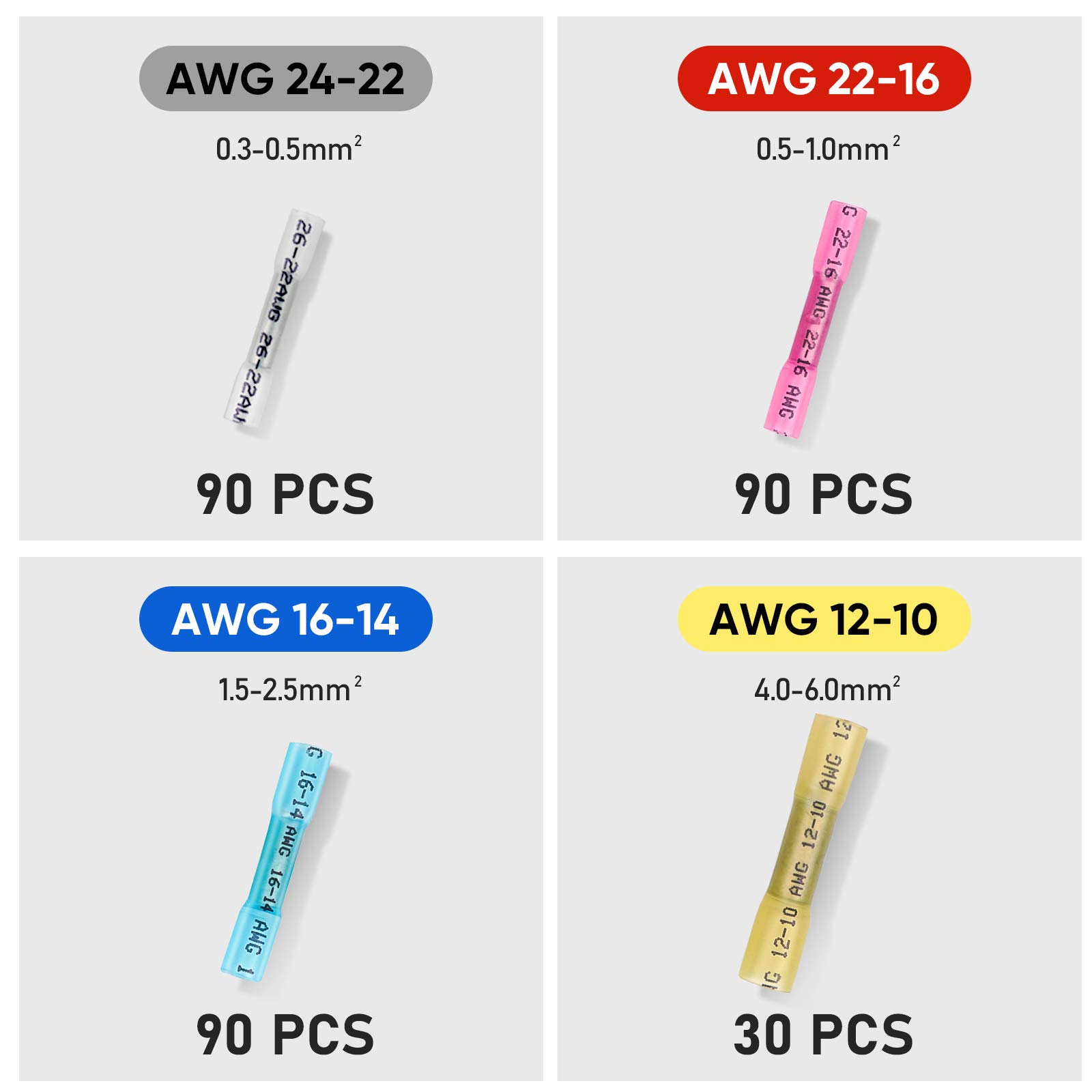 [WIDE APPLICATIONS] Compliant with all electrical standards, Perfect for marine and automobile applications, whether you are working on your boat, Vehicle, home, or scientific project, our electrical crimp connector will ensure a strong watertight seal to make sure everything bonds correctly. The connector assortment includes white (AWG 24 – 22), red (AWG 22 – 16), blue (AWG 16 – 14), and yellow (AWG 12 – 10) butt connectors that can be used on wire AWG from 24 to 10