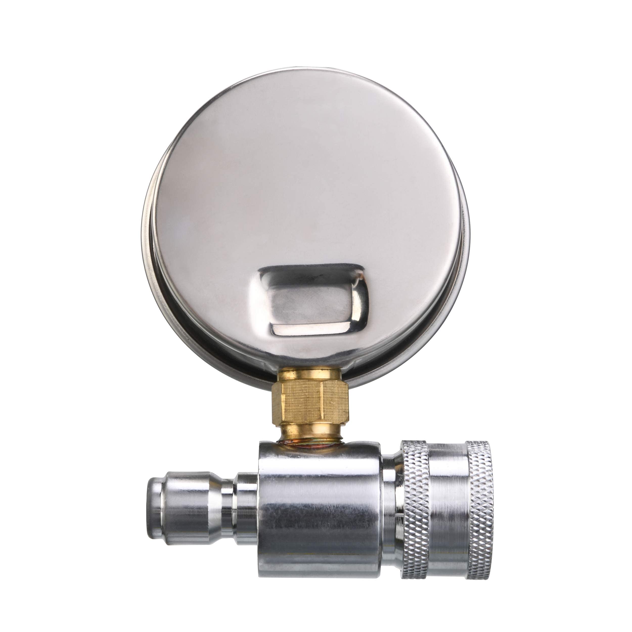 Inline pressure washer gauge has 3/8 inch quick connect socket and plug.