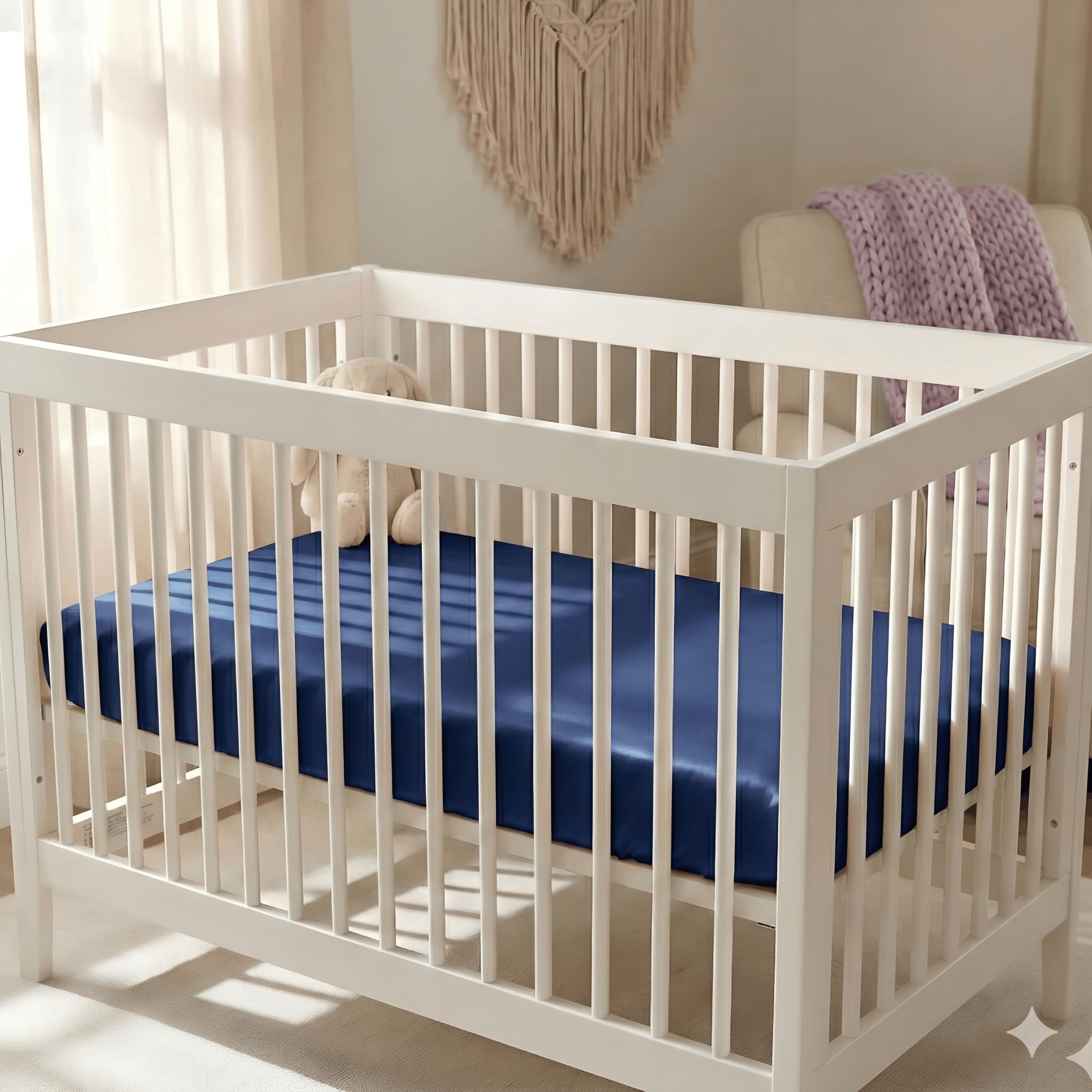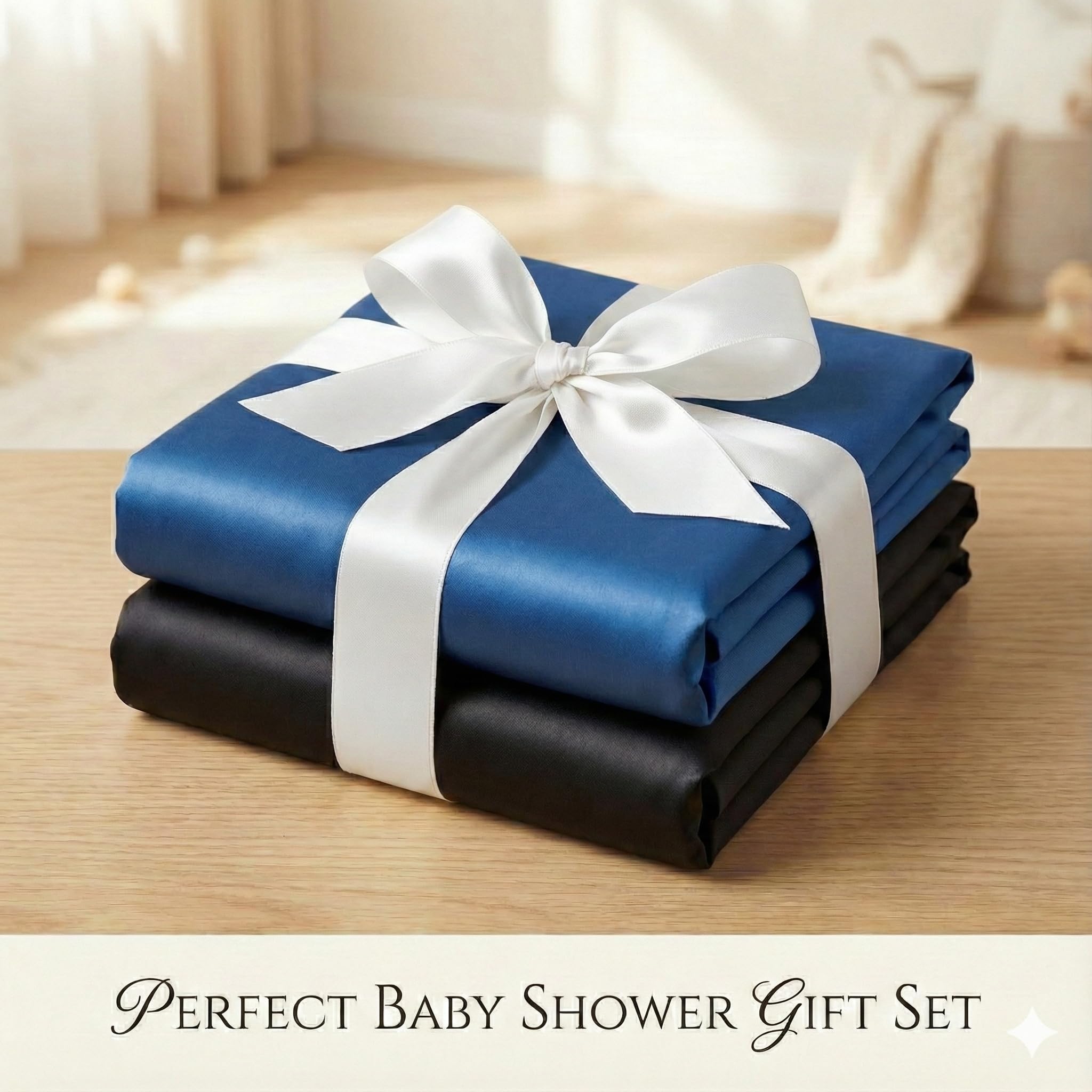 Add a touch of sophistication to your little one's room with the Pro Goleem Satin Mini Crib Sheets, offered in a bold Blue and Black set that is perfect for baby boy bedding or modern nursery styles. Engineered for superior comfort and care, our silky soft satin fabric provides a friction-free surface that helps prevent baby bald spots and protects fine hair from tangling, unlike rougher cotton alternatives. Sized precisely at 38" x 24" x 5", this fitted sheet features a fully encased 360-degree elastic hem to guarantee a secure, snug fit on standard mini crib mattresses and is also compatible with most Pack n Play or playard pads. The cooling and breathable nature of the material ensures your baby stays comfortable without overheating, while the dark colors offer a practical, stain-resistant option, making this hypoallergenic mattress cover an ideal, high-quality baby shower gift.