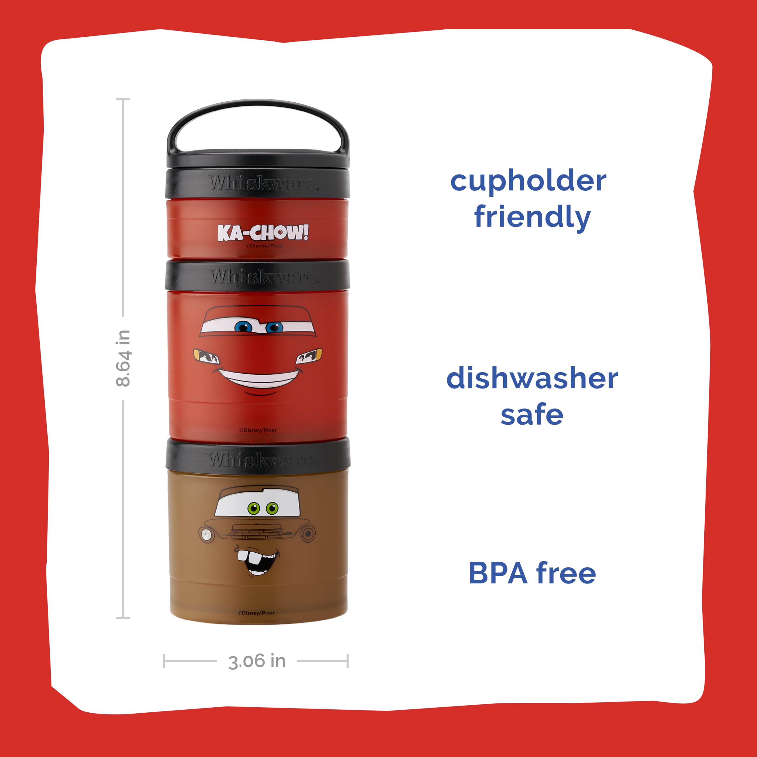 Whiskware Stackable Snack Packs with Pixar designs! Looking for environmentally-friendly ways to pack healthy, homemade snacks? Versatile, stackable, interlocking containers are perfect for on-the-go snacking or lunches. Each set comes with three dishwasher-safe jars: 1/3 cup, 1 cup, and 1 cup. Jars can be used on their own, or easily connected to each other with the quick-twist Twist 'n' Lock system. Removable carrying handle makes it easy to carry the stack, or clip it to a backpack or bag. Perfect for fruits, veggies, crackers, mixed nuts, and toppings. Or, fill them with tiny treasures and toys. BPA- and phthalate-free; dishwasher and freezer safe. Manufacturer’s limited lifetime warranty.