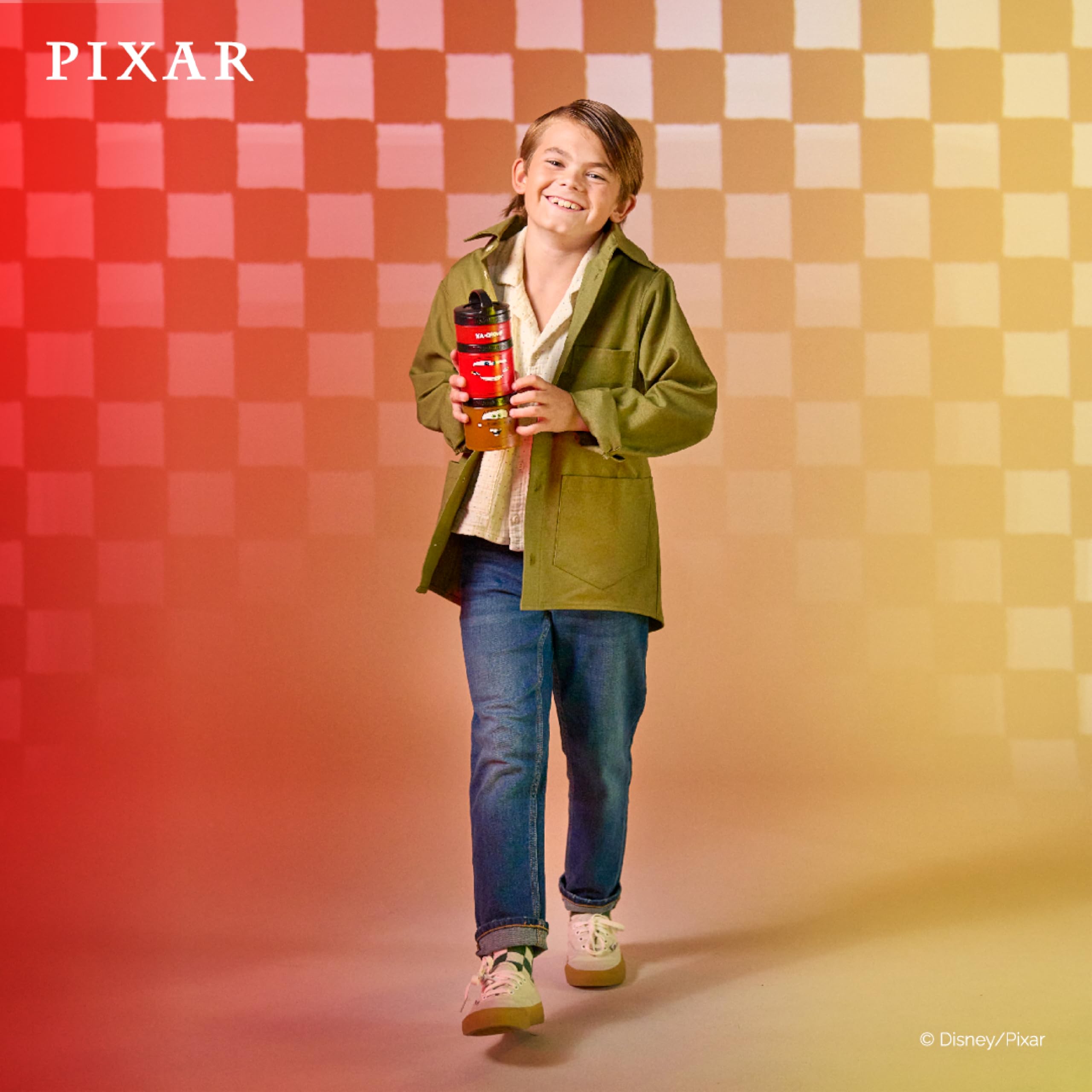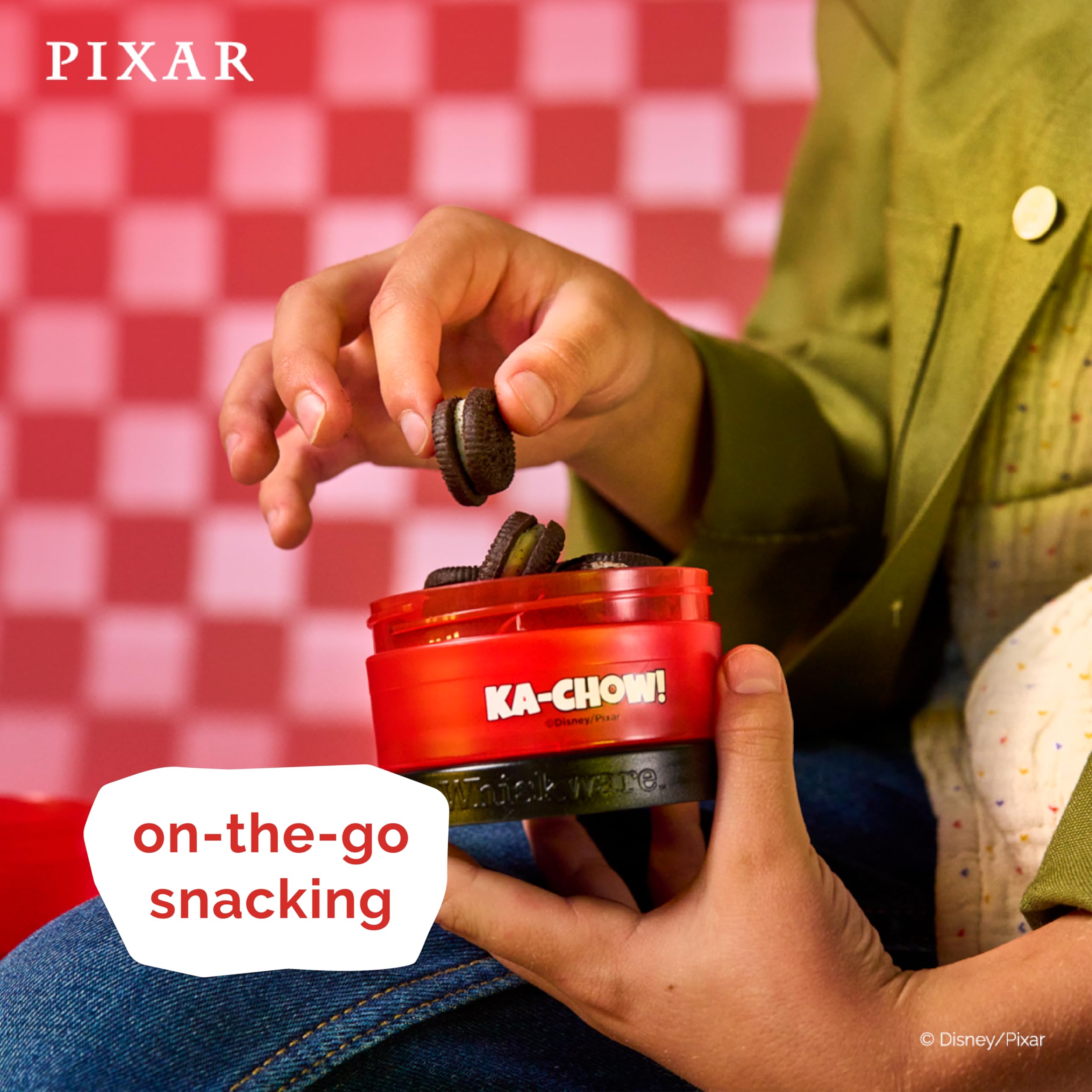 Stackable, interlocking containers for snacking on the go, featuring officially-licensed Pixar graphics