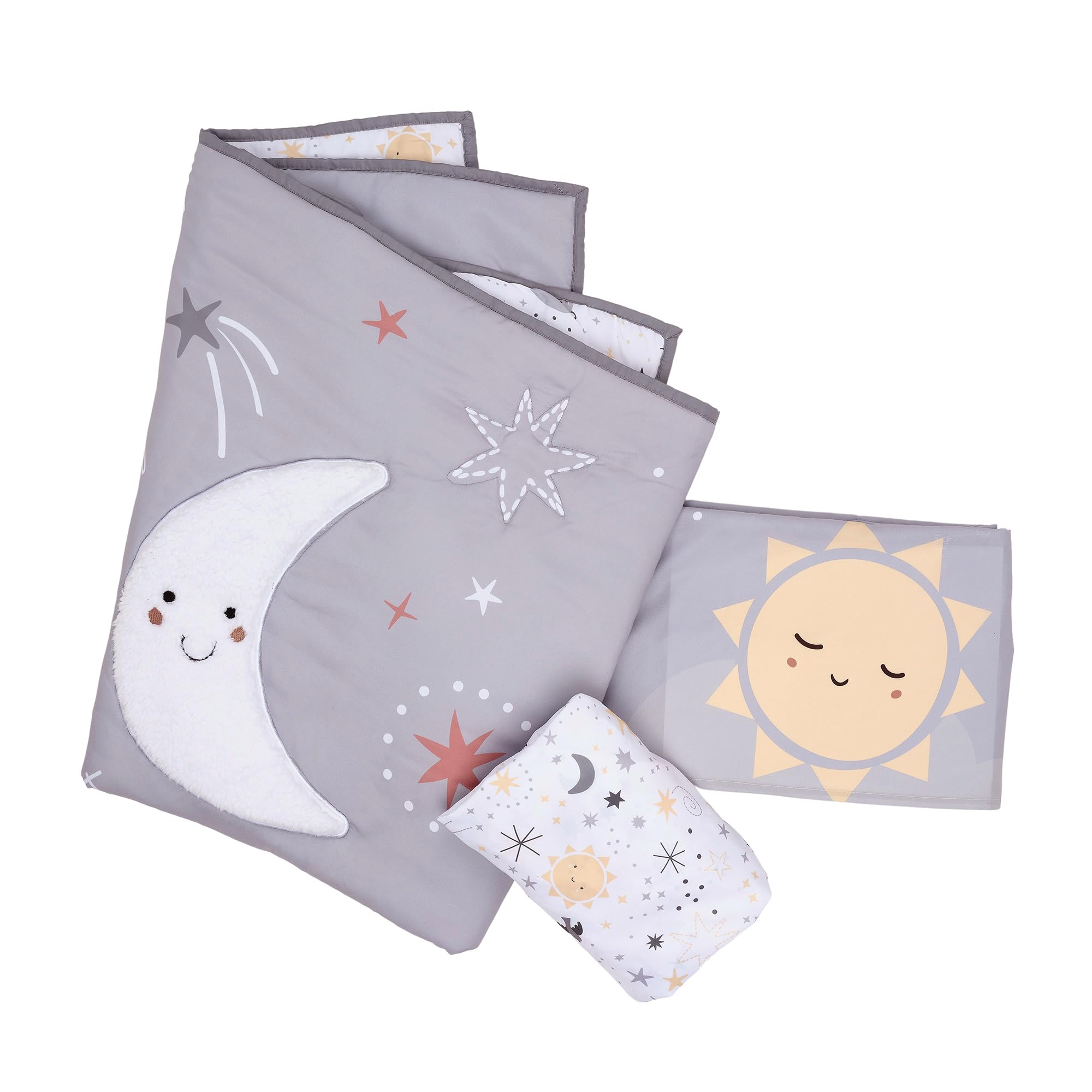 The decorative crib skirt features happy crescent moons, cute yellow suns, and multi-color stars