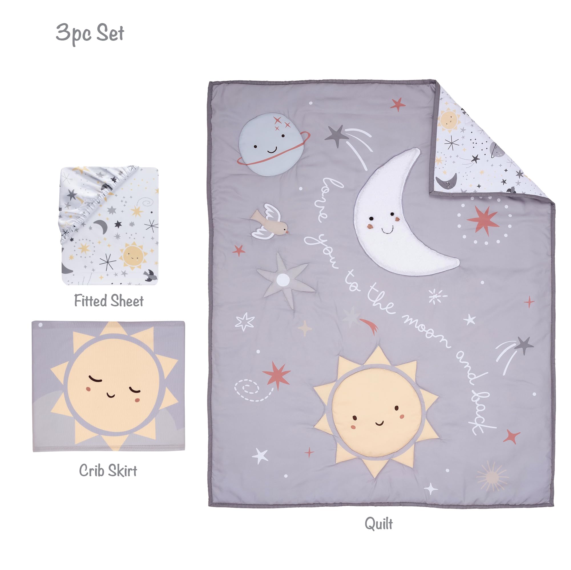 3-piece set includes one quilt, one fitted crib sheet and one decorative crib skirt