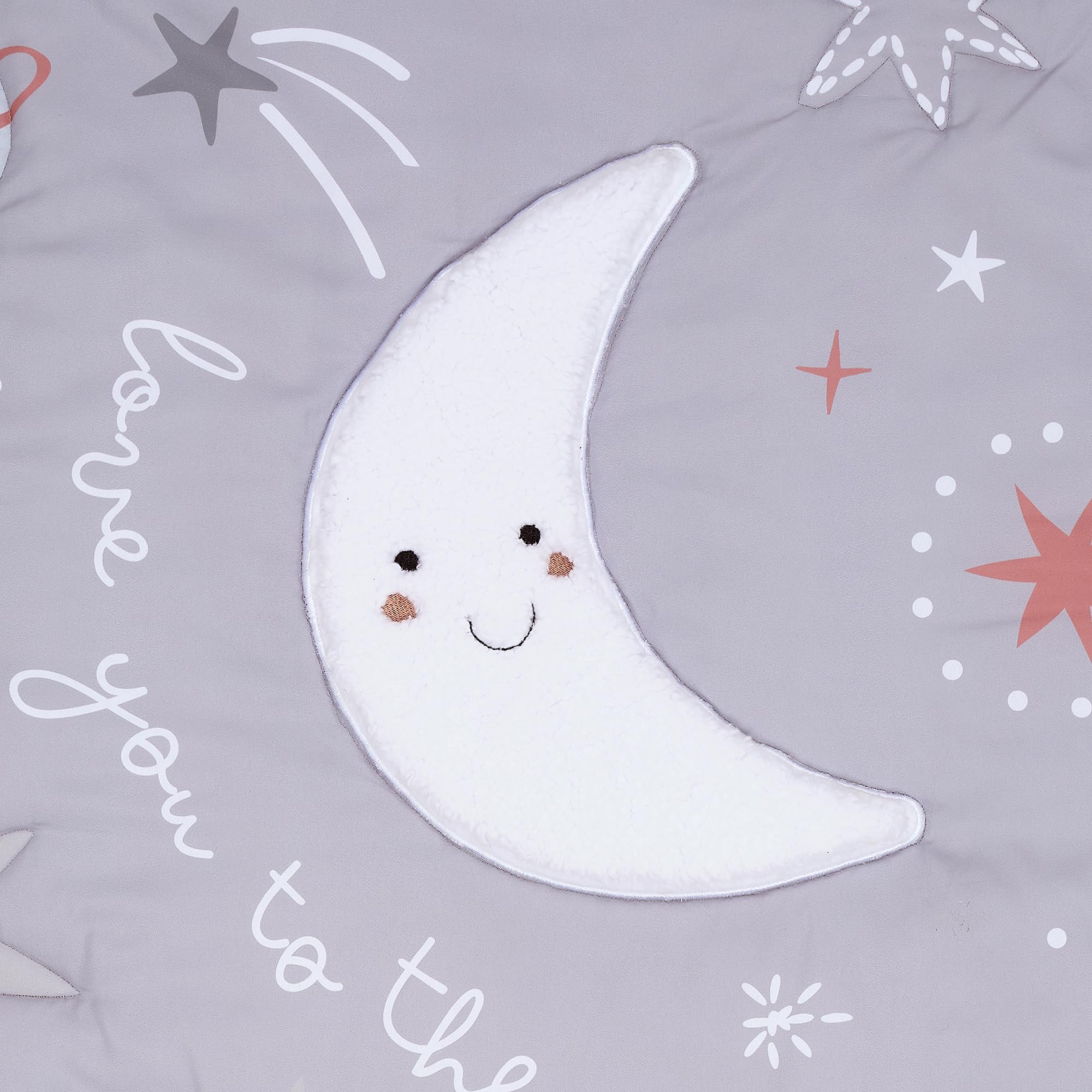 Appliqued crescent moon in soft white faux shearling with an expertly embroidered face