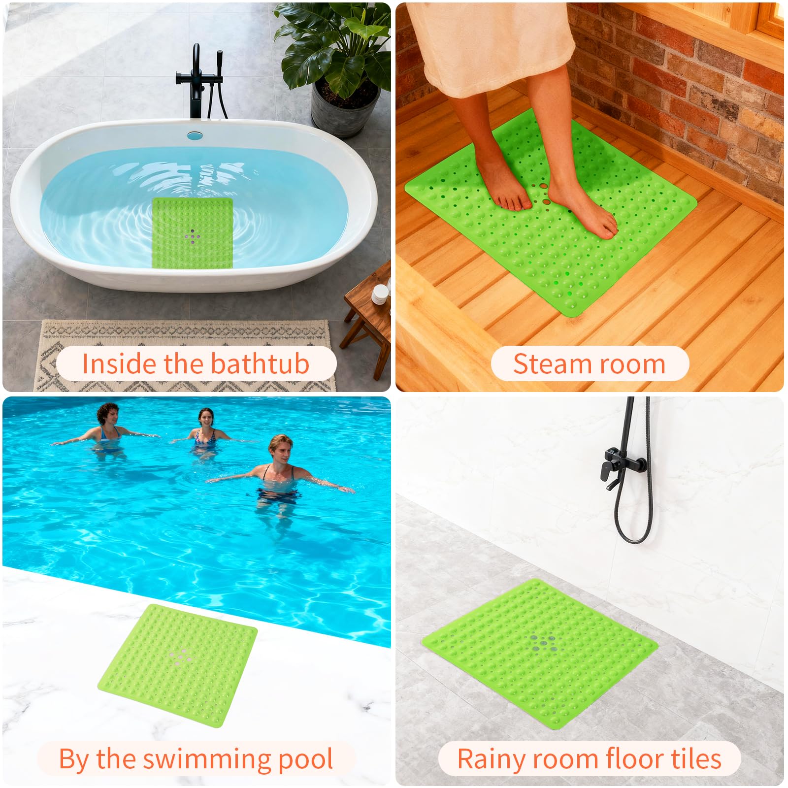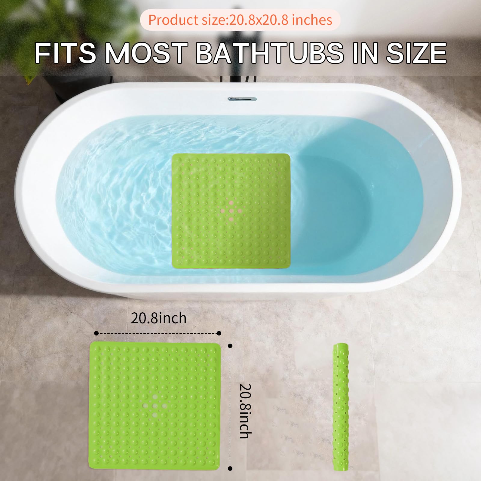NON-SLIP LARGE BATH MAT: Our non-slip large bathtub mat offers superior coverage with its 20.8×20.8 inch(Approximately 53×53cm, with an error of about 1cm) size, maximum coverage for the bathtub floor. Equipped with 164 special large suction cups, this mat securely stays in place on smooth, clean surfaces, making it ideal for home, spa, sauna, gym baths, and showers.
