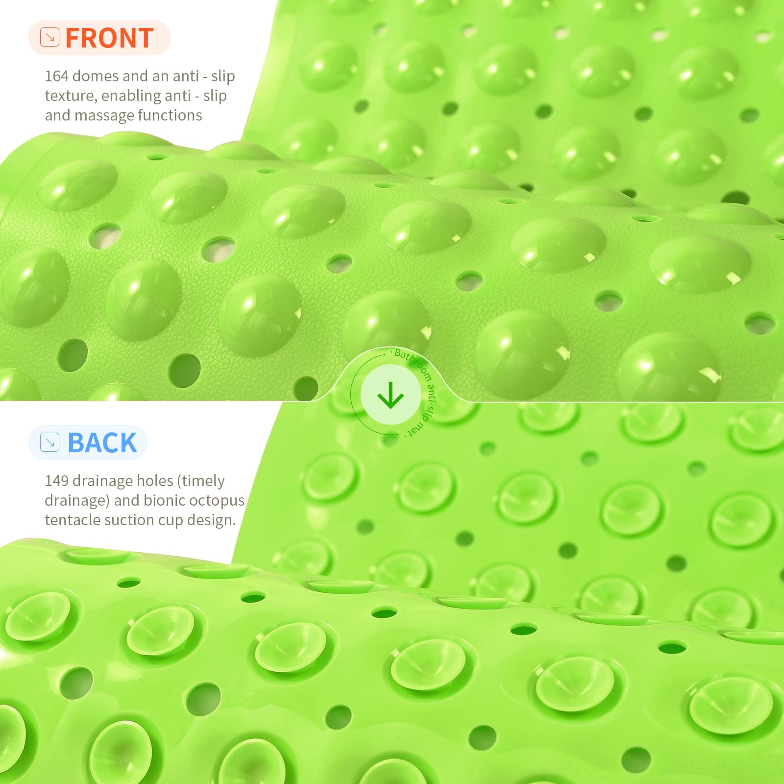 FUNCTIONAL BATHROOM MAT: Our versatile bath mat features a domed design resembling pebbles, offering a massage-like experience during shower time. The irregular texture on the surface enhances friction and prevents slipping. Additionally, with 149 small drain holes, water circulation is optimized and smoother drainage.