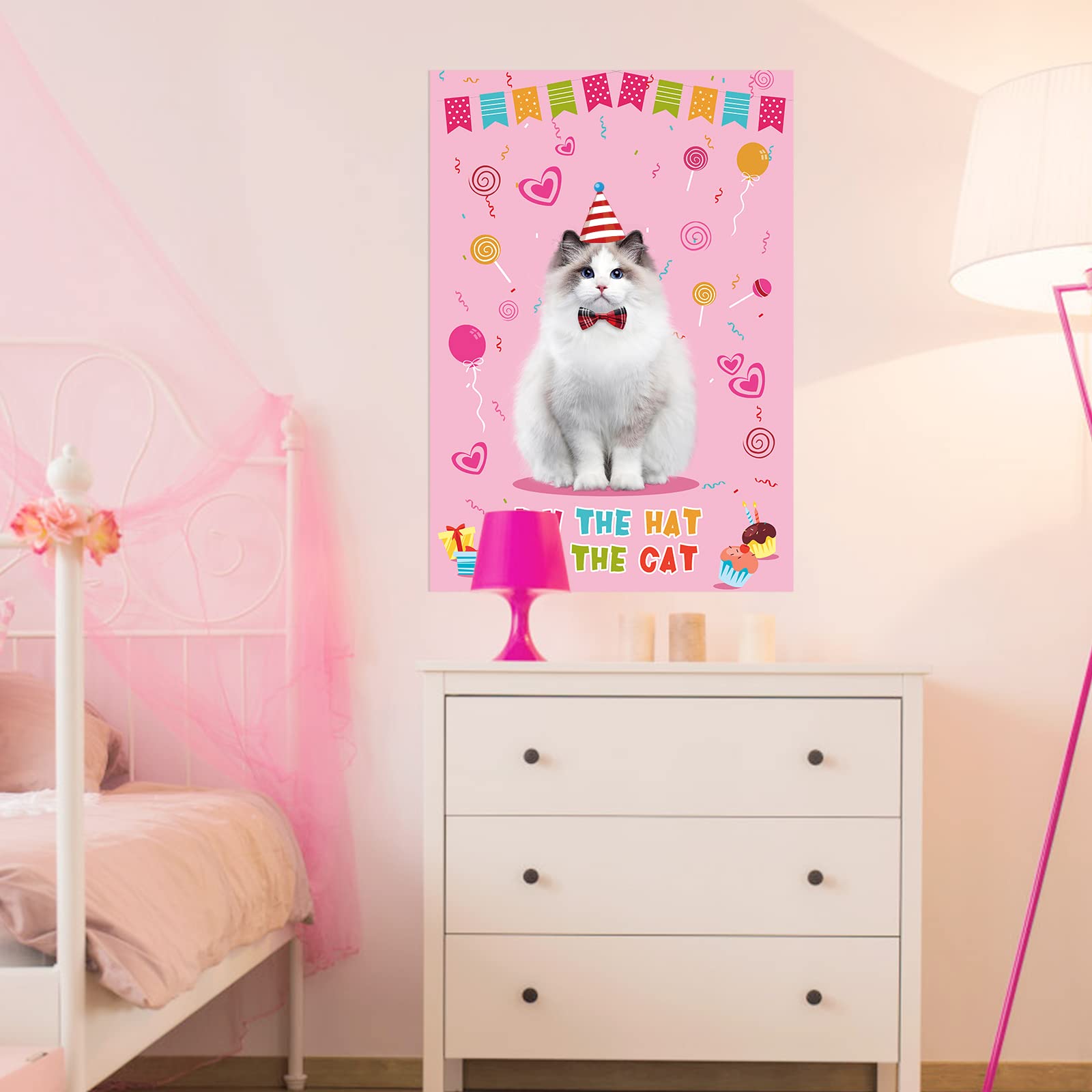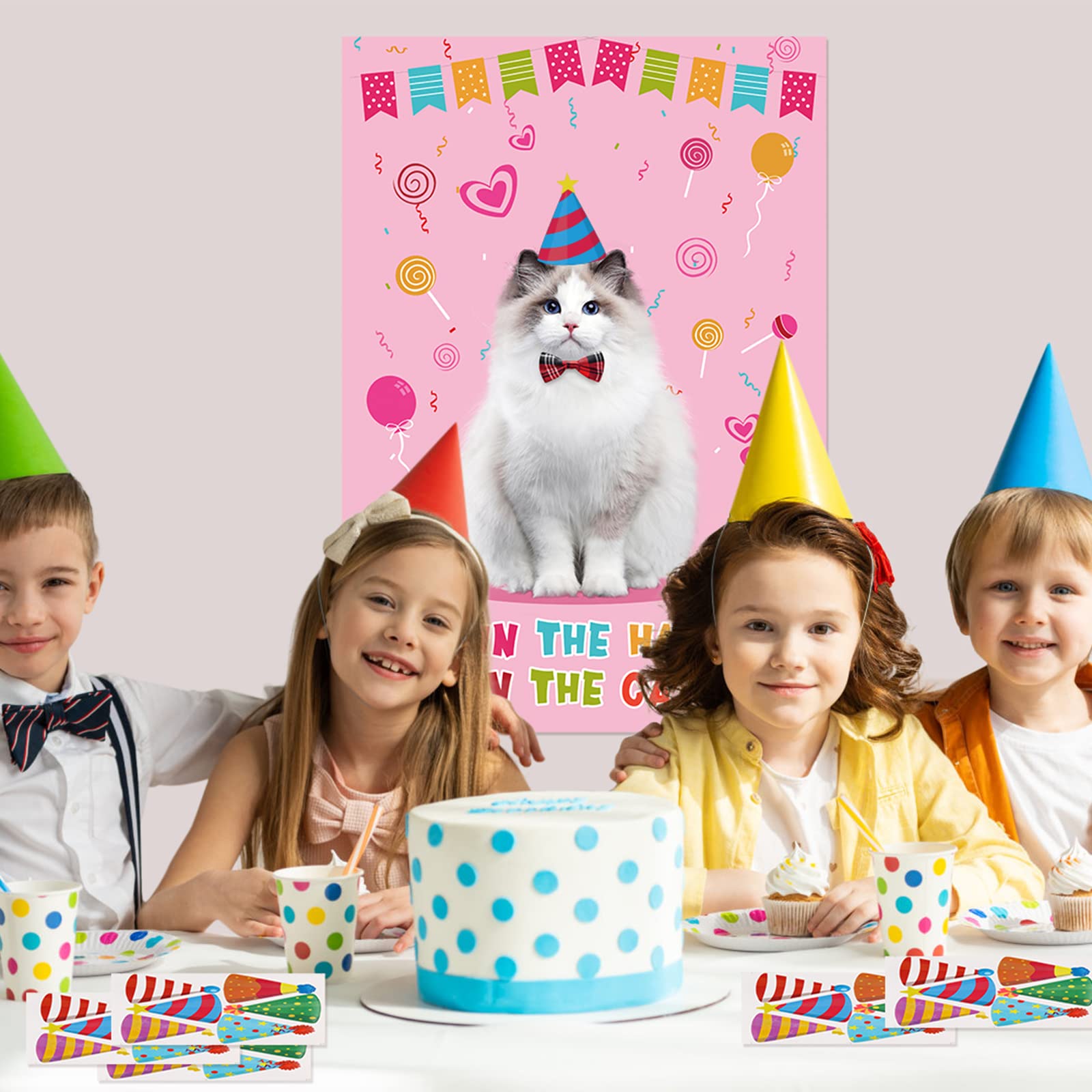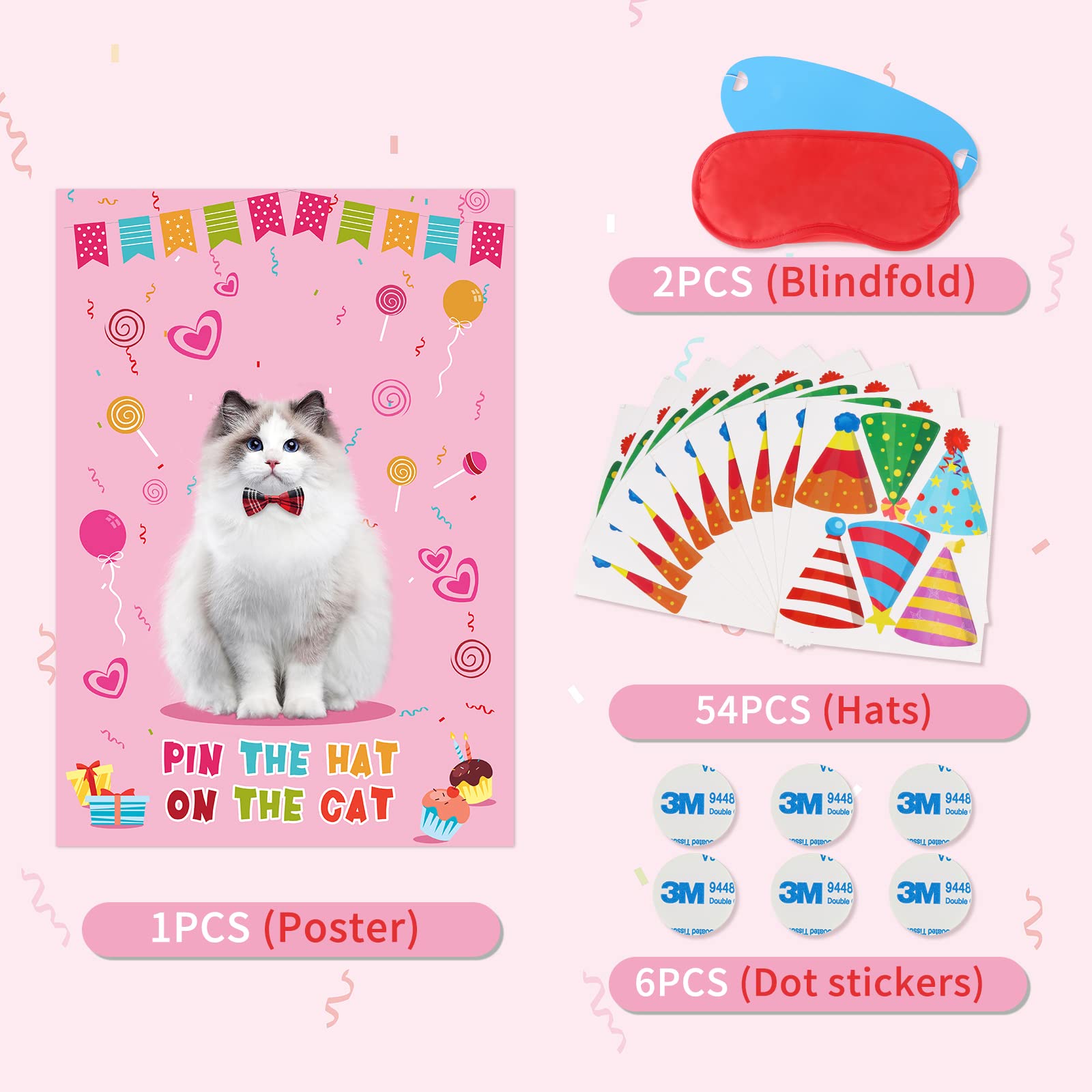 Cat Party Games Set Includes: 1pcs 29 x 19 inch large high gloss waterproof cat poster + 1pcs polyester blindfold mask+ 1pcs paper blindfold mask+ 54pcs hat stickers + 6pcs free double-sided adhesive.