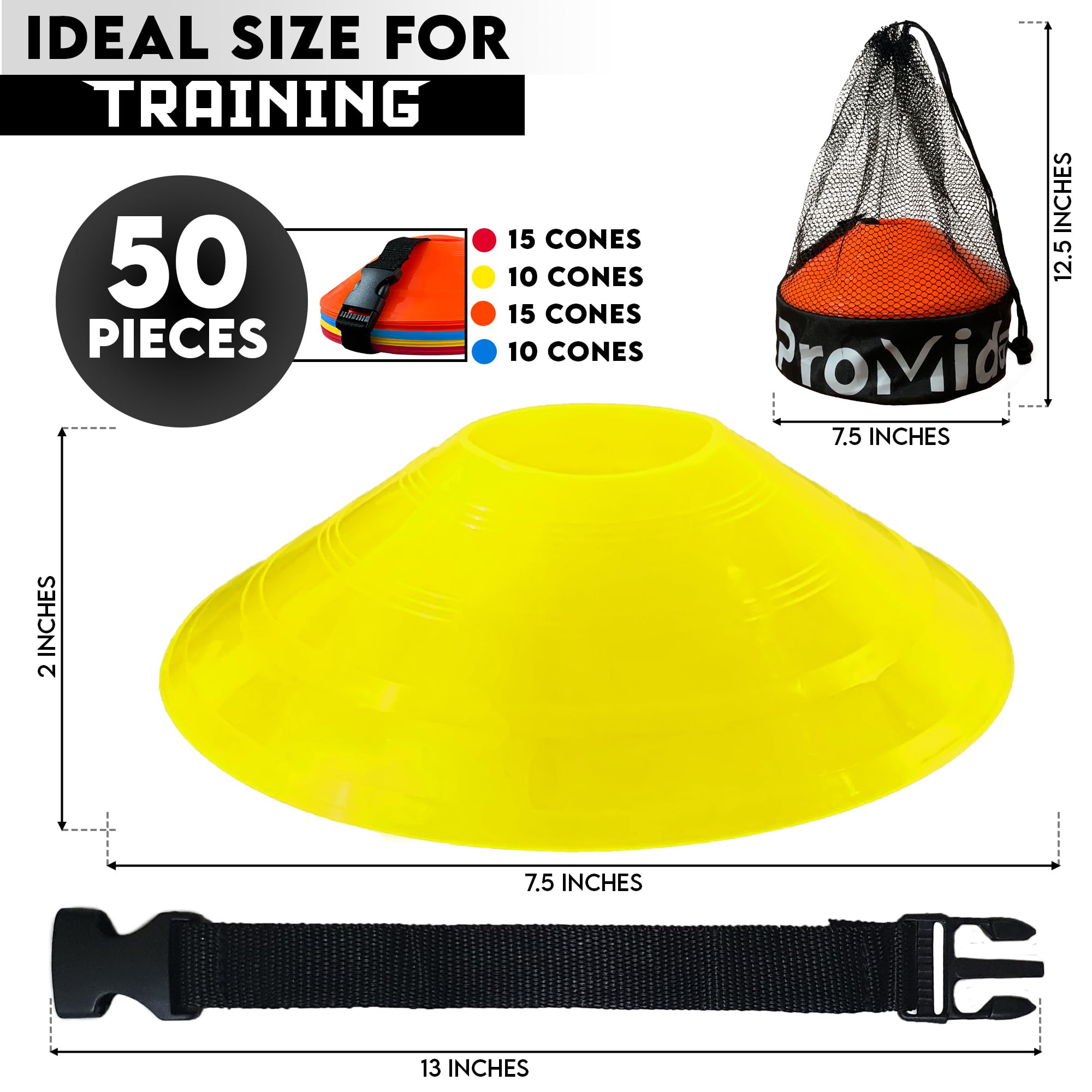 Hassle-Free Training: Our mini agility cones for training soccer Include a convenient mesh bag with straps for easy handling and storage of colored cones. Length of strap is long enough to hold all Disc cones. These basketball training cones and football cones for drills youth are perfect for enhancing speed and coordination during practice sessions