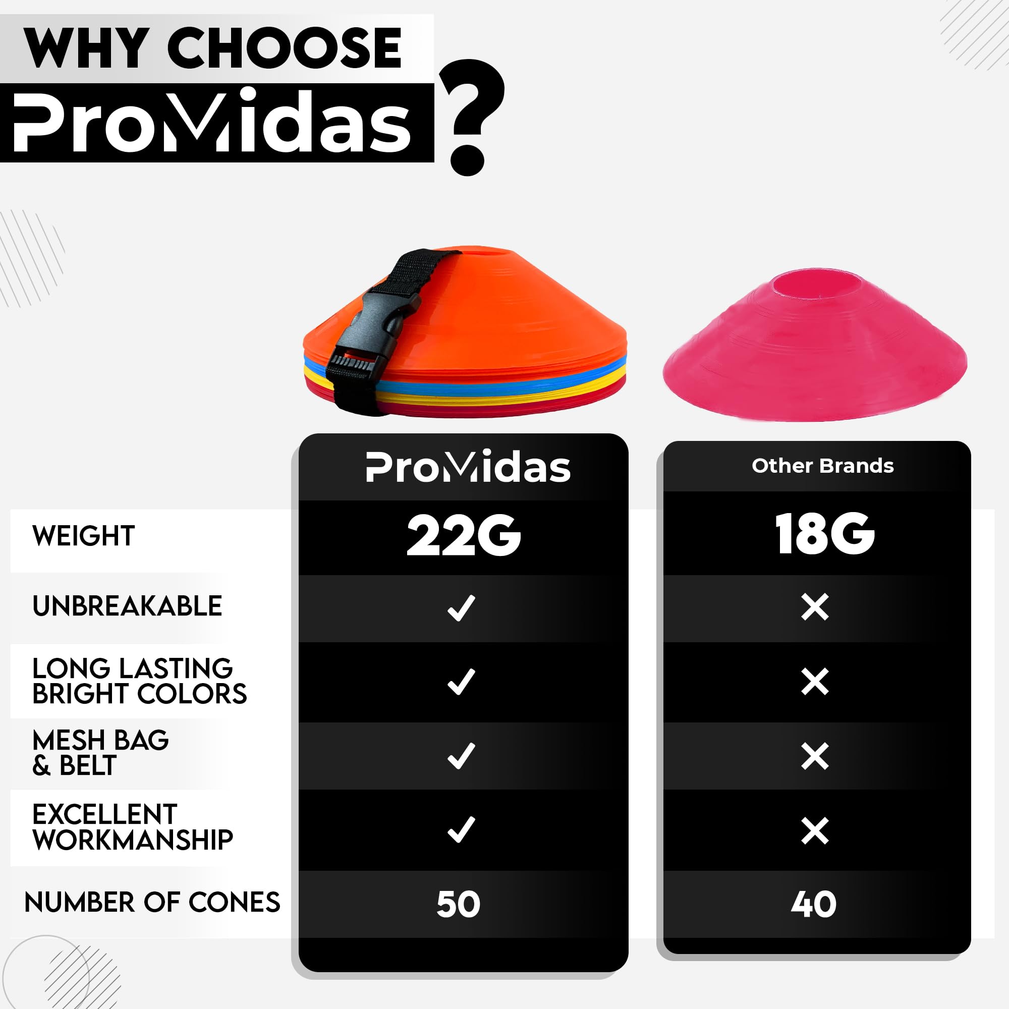 Flexible agility cones for training: Our ProMidas mini soccer cones for kids are built tough with high-quality PP material & weigh of each soccer cone is around 22g, ensuring they withstand rough play & extreme weather without cracking or breaking, providing long-lasting performance