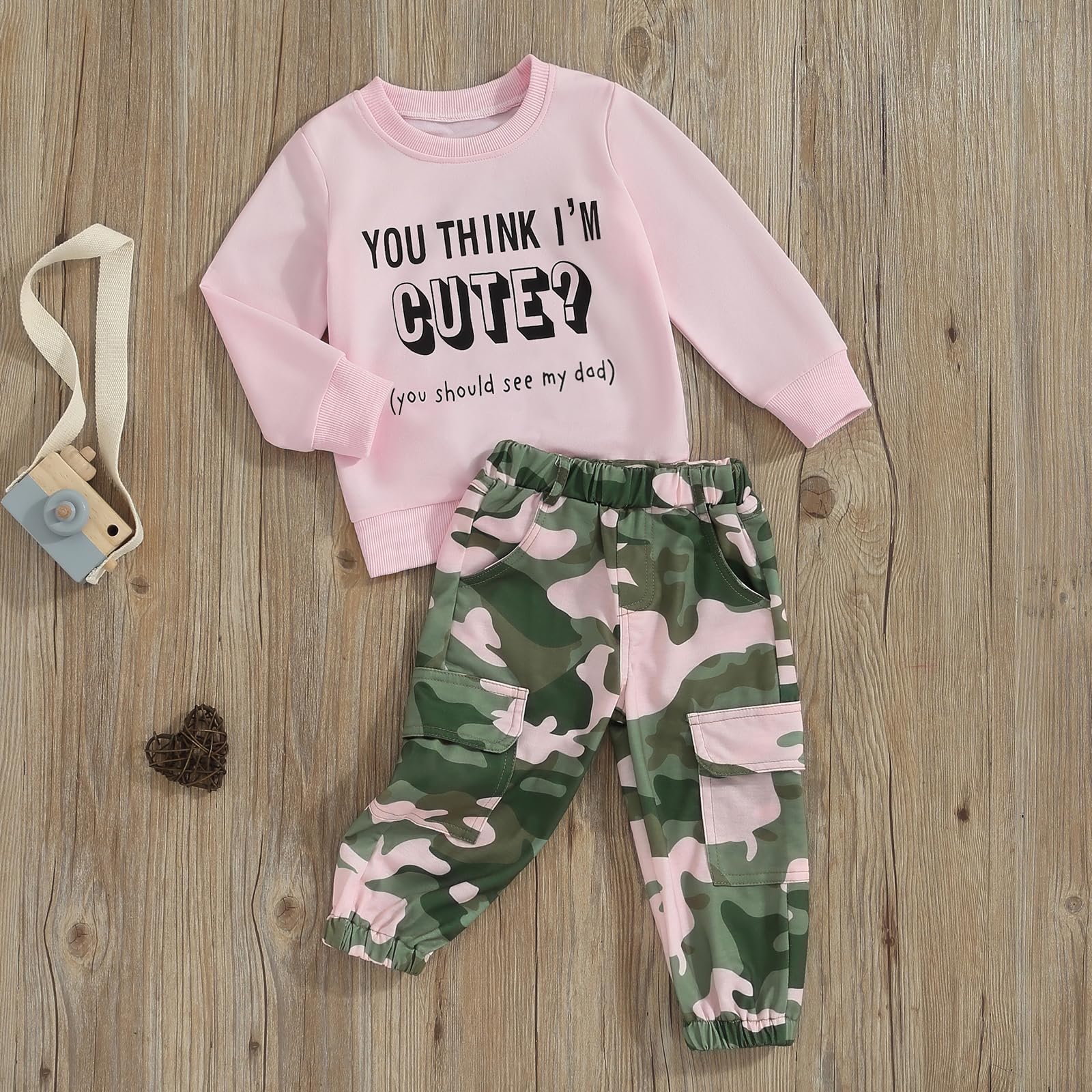 ♥Design: Baby girl fall outfits, pullover sweatshirt features letter print, long sleeves and a round neck. Trousers feature camouflage print and pockets.