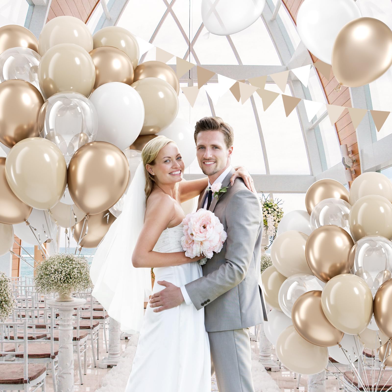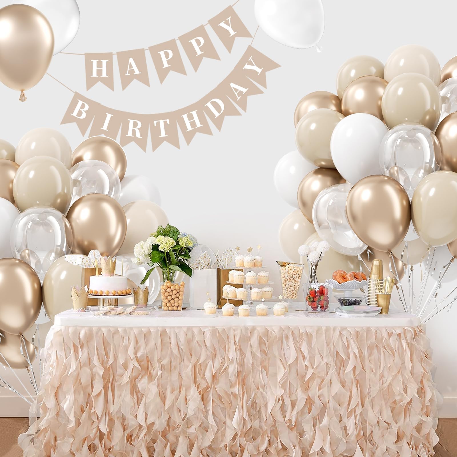 Package Include: The beige balloons include 12inch white balloonsx15, 12inch clear balloonsx15, 12inch sand white balloonsx10, 12inch ivory cream beige balloonsx10, 12inch metallic champagne gold balloonsx10, glue dotx20, ribbonx1, decorative stripx1