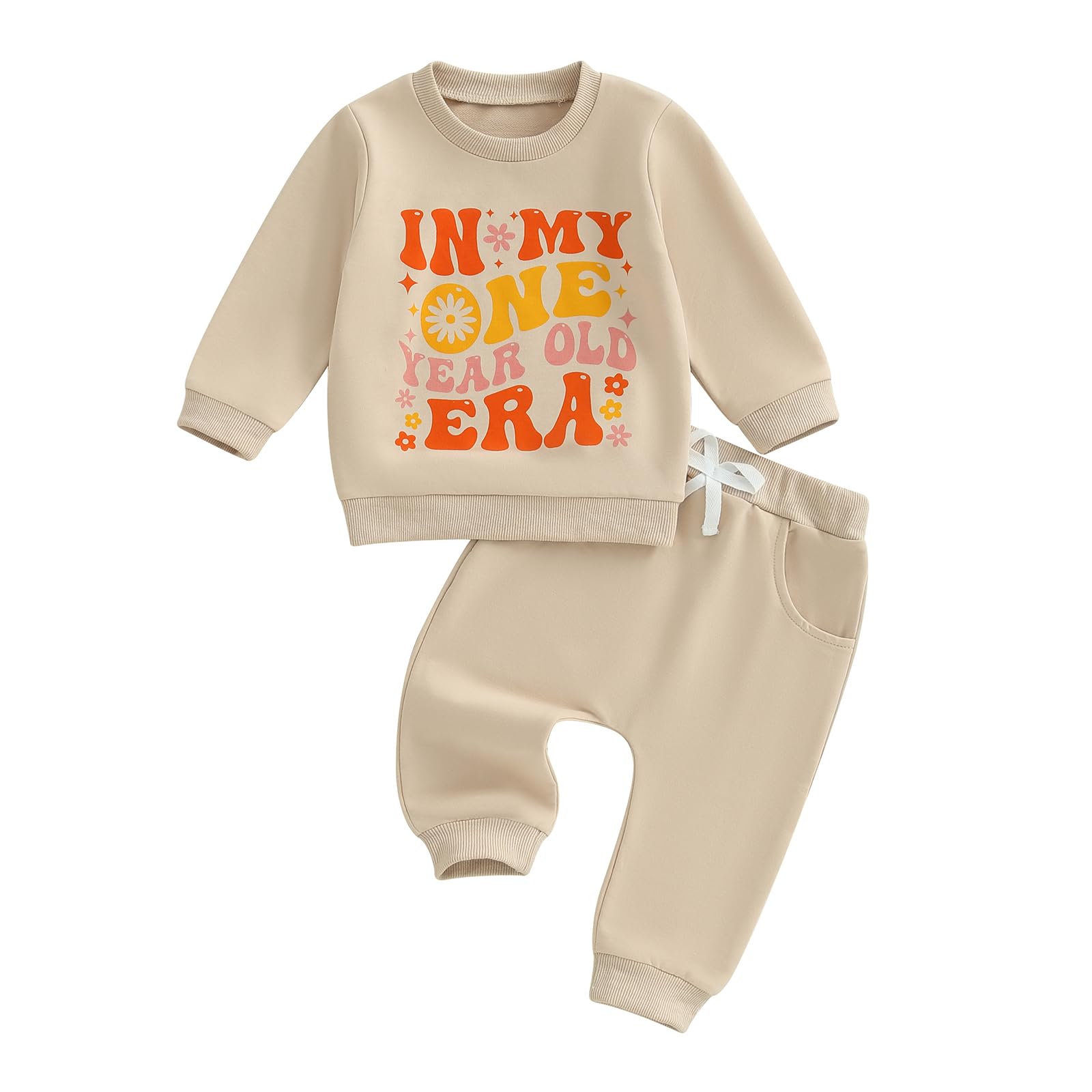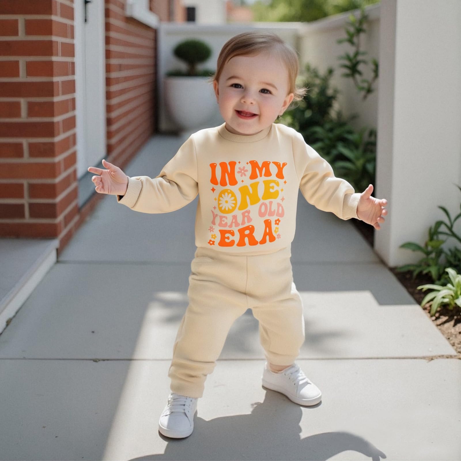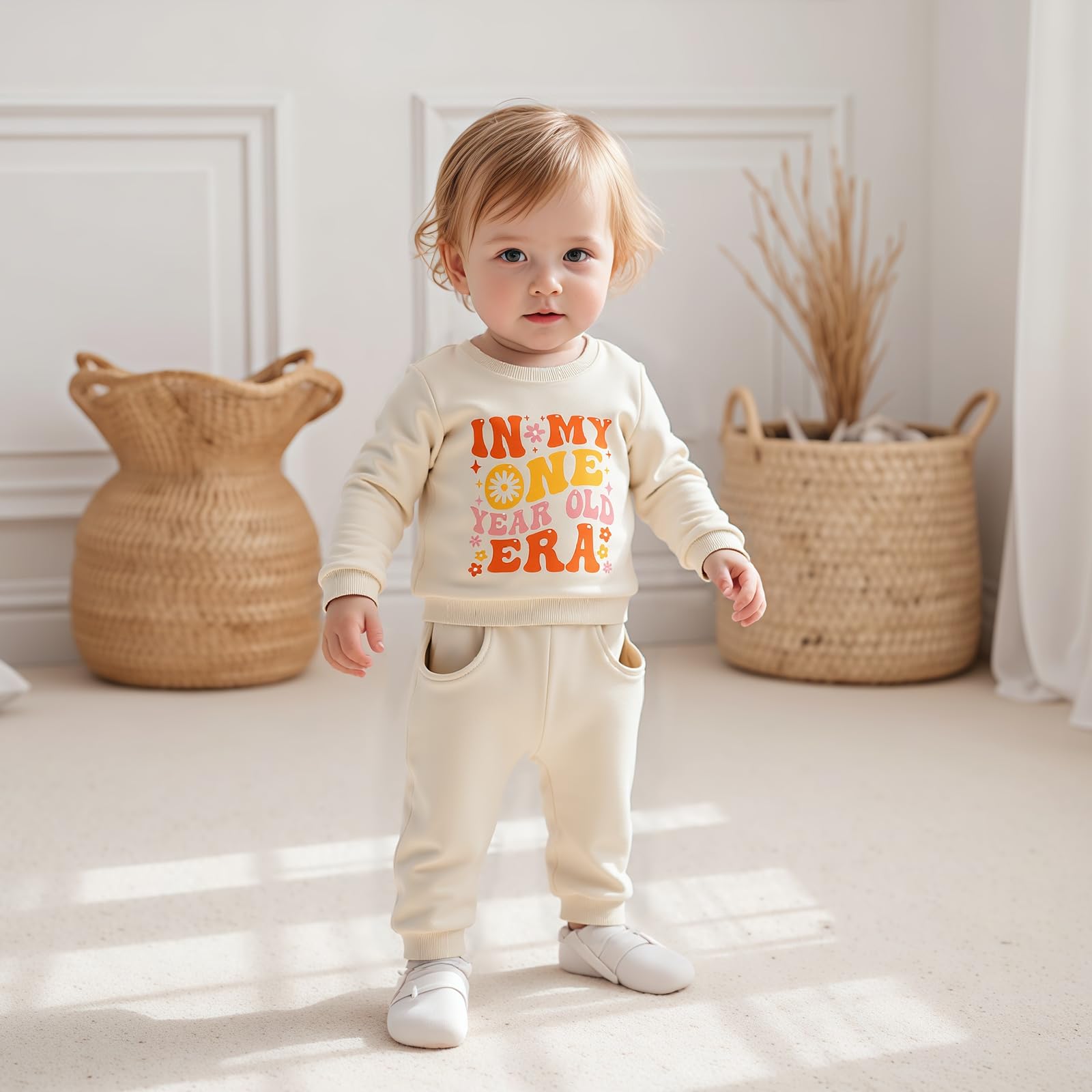 Design: Baby girl first birthday outfit, long sleeve, crewneck, in my one year old era print, 1st birthday sweatshirt, matching with elastic waist solid pants, very cute and trendy sweatsuit for spring,fall and winter, 1st birthday gifts girl, girls first birthday outfit