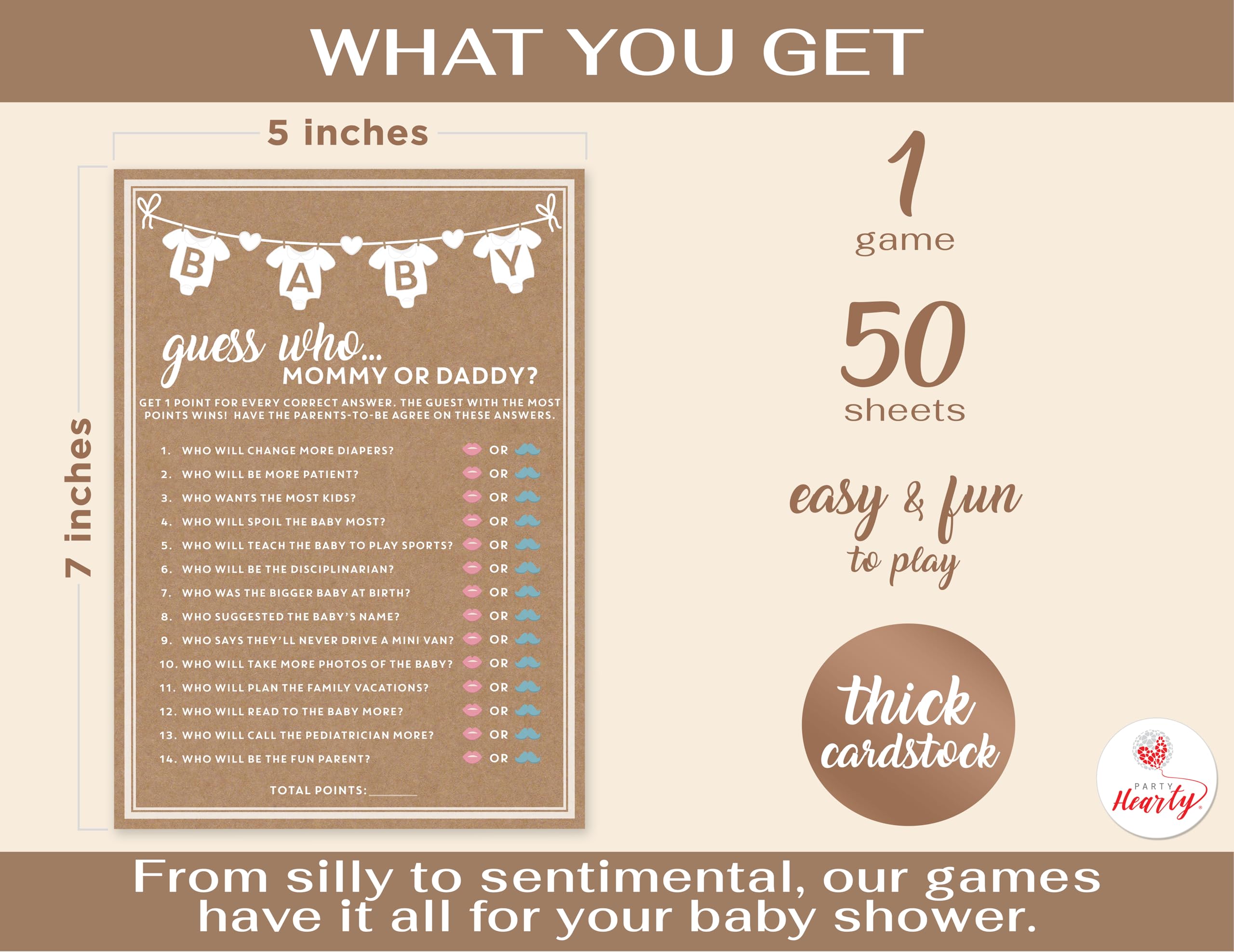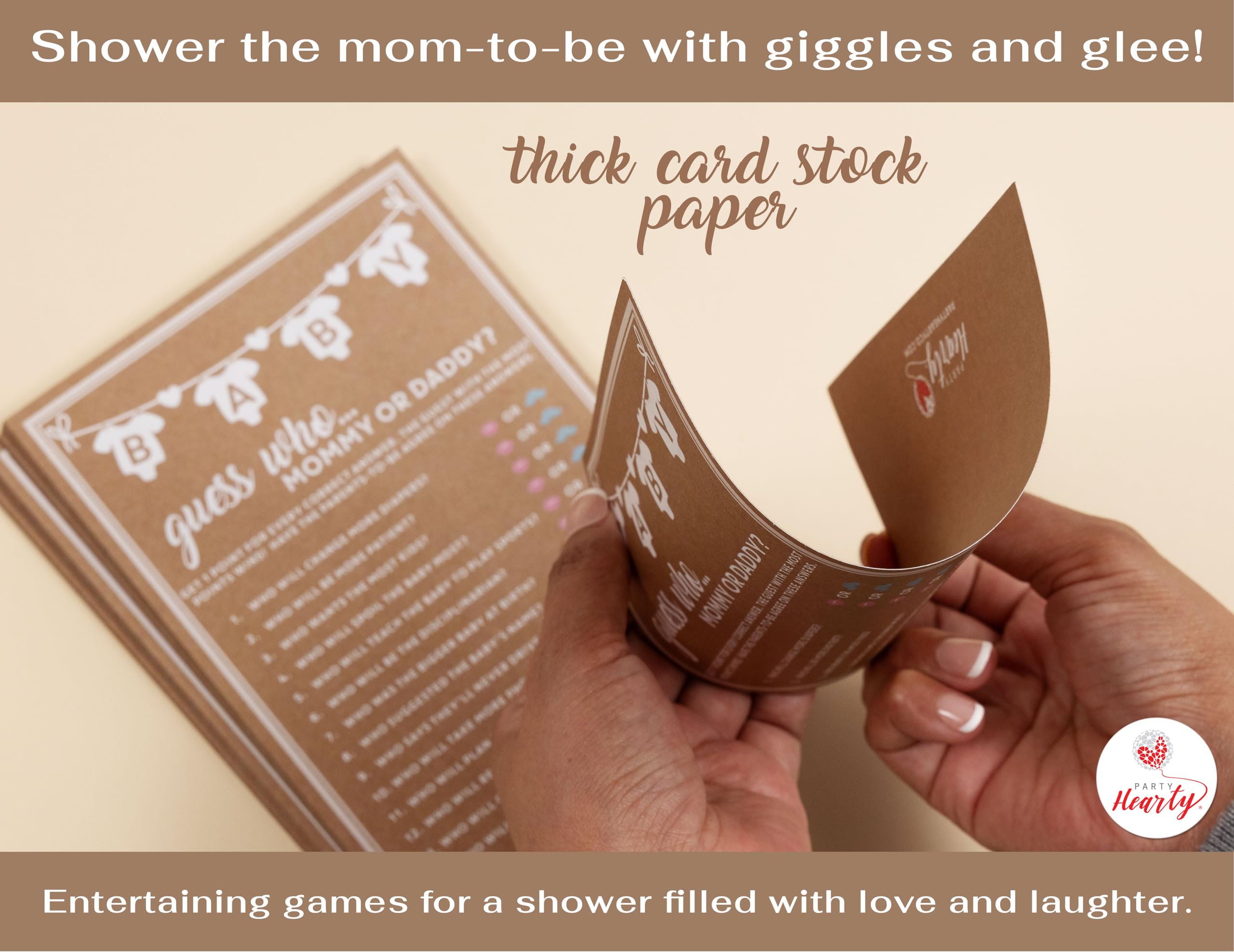 BABY SHOWER GAME EXTRAVAGANZA Includes 50 cards of Guess Who Mommy or Daddy; Professionally printed on thick matte premium offset papers, sturdy & easy to write on; It measures perfectly at 5x7 inch
