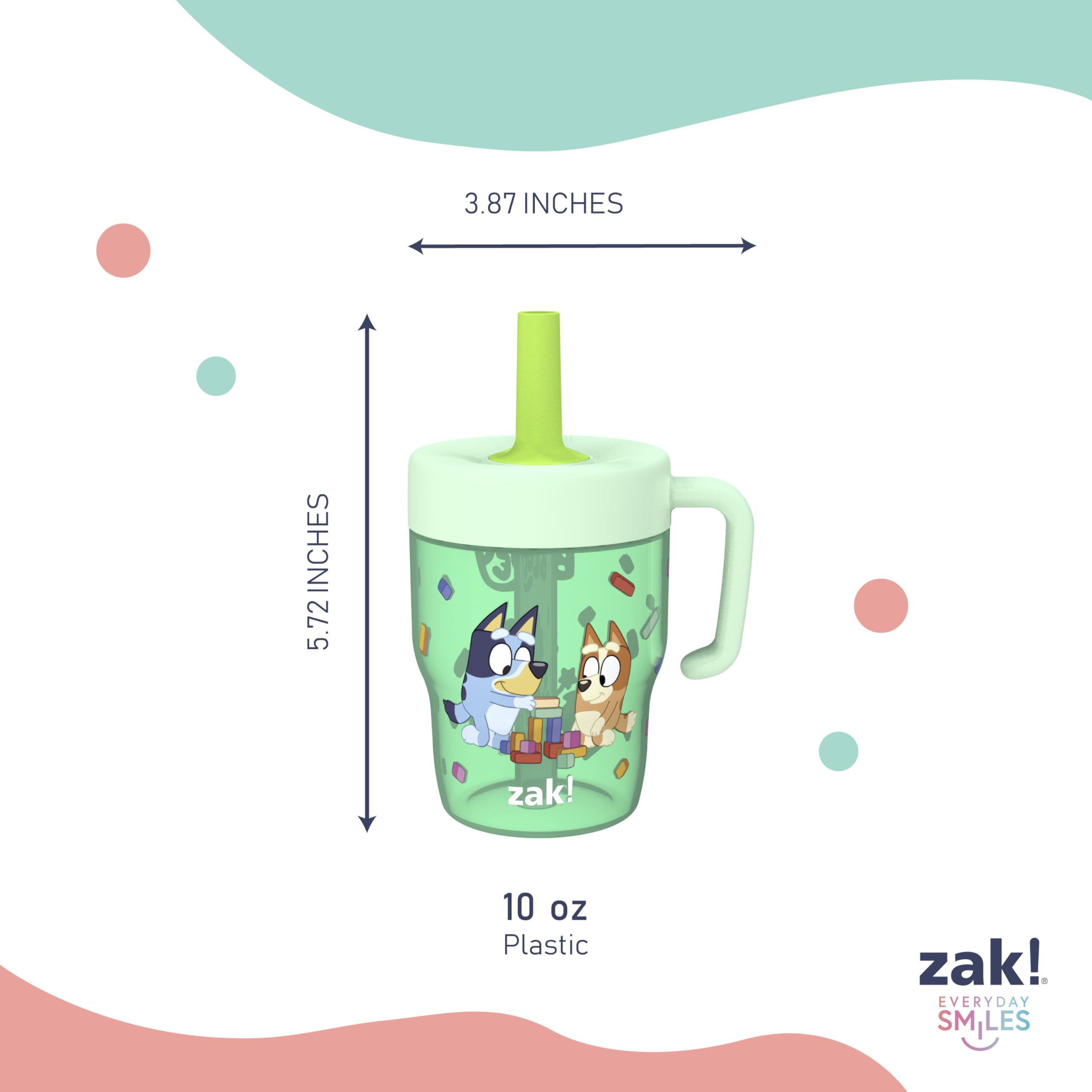 These leak-proof kids' tumblers from Zak Designs make hydration fun for Bluey fans! Durable Materials: These tumblers are made from lightweight plastic, and the comfortable straws are made from silicone. Everything is dishwasher safe, and the lid can be disassembled for easy cleaning. Leak-Proof Straw: The straws have built-in valves that allow liquid to flow when drinking and prevent spills when the tumblers are tipped over. You don't have to worry about spills or stains around fabrics or electronics, and drinks stay easily accessible. Hydrate Anywhere: The tumblers won't splash or leak and fit in car cup holders, making them ideal to take on the go. They also have handles that make it easy for small hands to carry around. Specifications: Set of two tumblers with 10 oz capacity. Made of durable plastic and silicone. Dishwasher safe, do not microwave. Length: 2.94-inch, Width: 3.87-inch, Height: 5.72-inch. Character: Bluey and Bingo (Bluey).