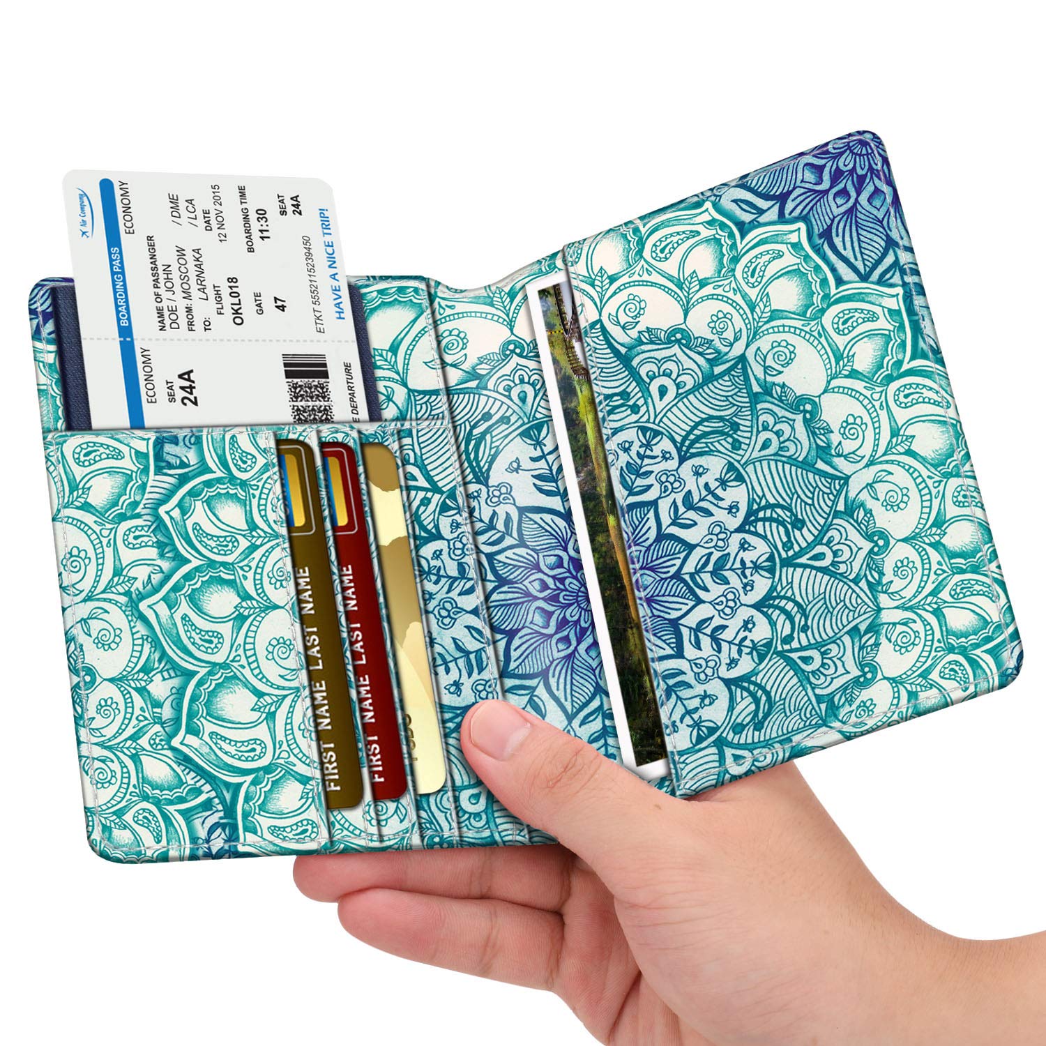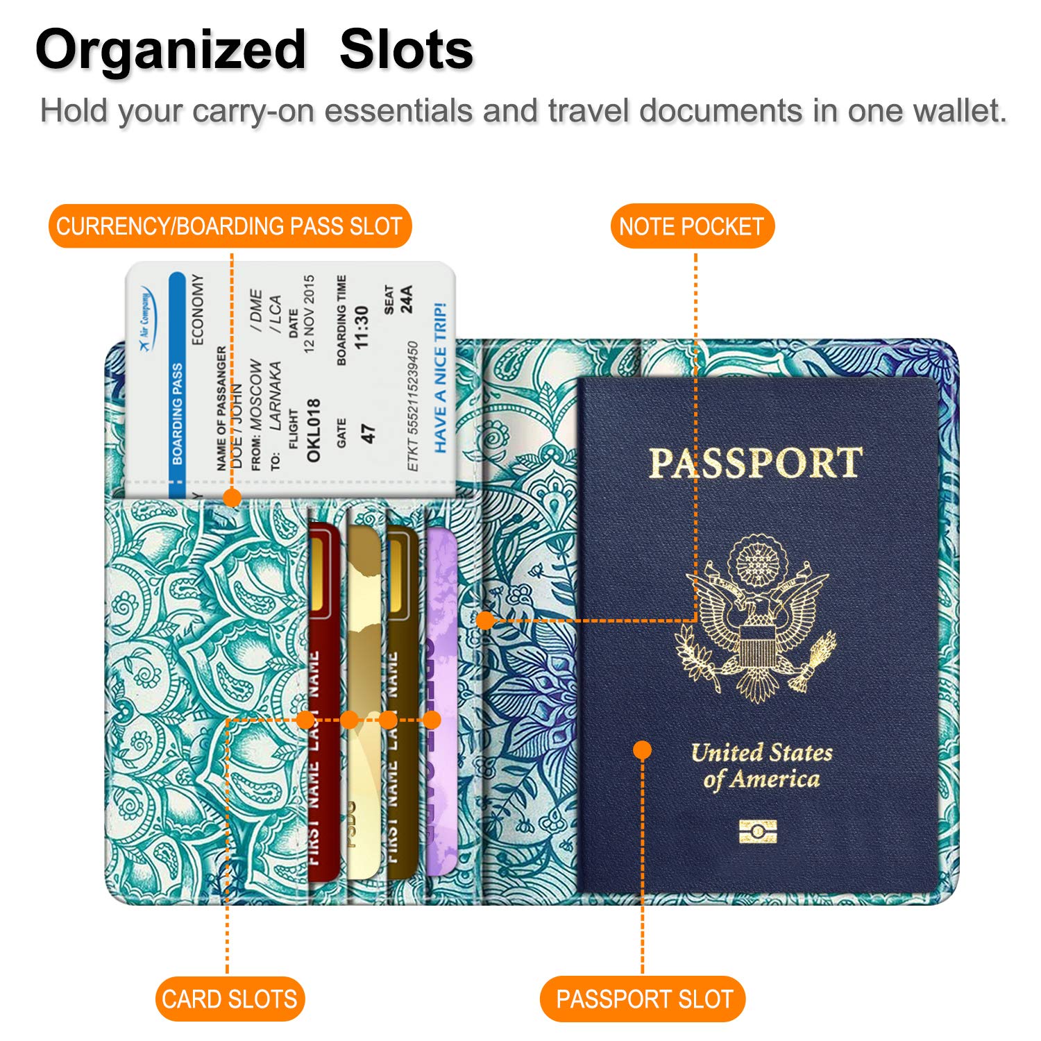 Big Capacity: The passport holder is equipped with practical slots that are designed to hold your passport, business cards, credit cards, and boarding passes efficiently. This enables convenient access to important information during the boarding process and while in transit, keeping everything organized in one place.